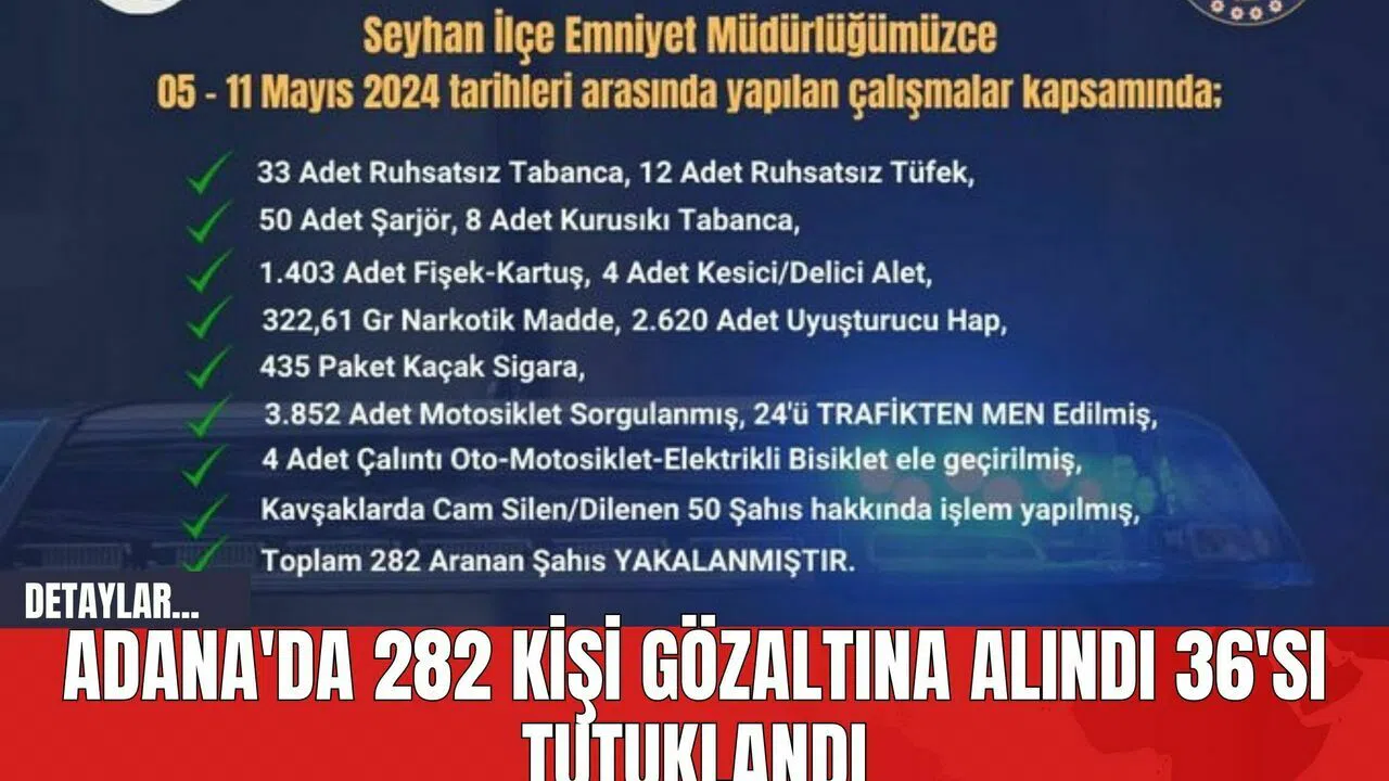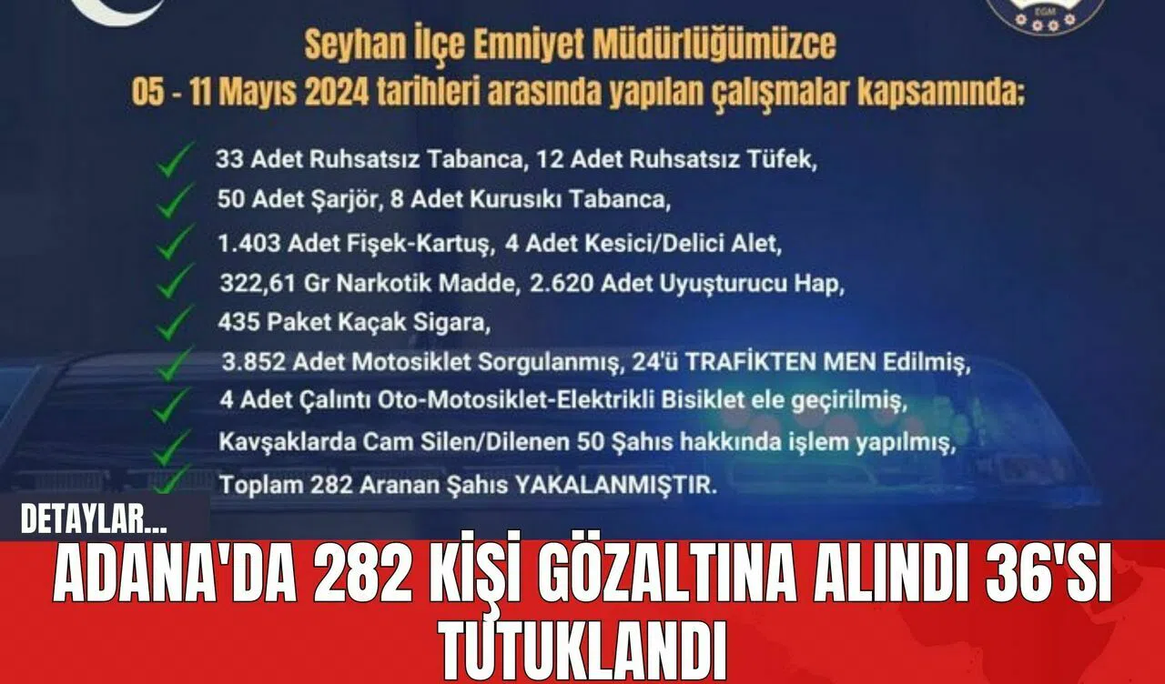 Kentte suçun önlenmesi ve suçluların yakalanması amacıyla yoğun çaba sarf eden Seyhan İlçe Emniyet Müdürlüğü ekipleri, son bir hafta içinde önemli başarılar elde etti. Yapılan operasyonlarda, aralarında ruhsatsız silah bulunduranlar olmak üzere 282 kişi yakalandı. Bu kişilerden 36'sı tutuklandı. Tutuklananların arasında 8 kişi ruhsatsız silah taşıdığı gerekçesiyle, 28 kişi ise çeşitli suçlardan dolayı tutuklandı.