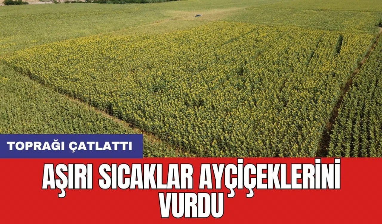 Adana'nın Kozan ilçesinde bu yıl aşırı sıcaklar nedeniyle ayçiçeklerini erken kurudu. Tam olgunluğa ulaşamadan kuruma başlayan ayçiçek tarlalarındaki yarıklar kuralığı kuraklığı gözler önüne serdi. Aşırı sıcaklıkların etkili olduğu bölgede ayçiçek tarlalarındaki kuraklık manzarası havadan da görüntülendi.