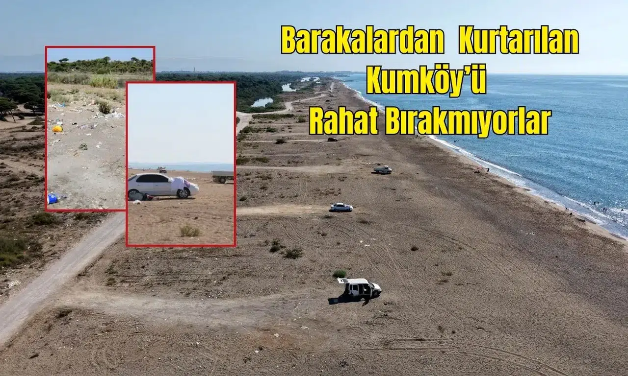 Kumsalın girişinde 'Dikkat Deniz Kaplumbağası Yuvalama Alanı' yazılı uyarı tabelası ile birçok noktasında ise 'Kumköy sahiline konaklama amaçlı her türlü yapı, karavan, çadır vs. yerleştirilmesi yasaktır' yazılı tabelalar olmasına karşın çok sayıda karavan ve çadırın uzun süredir sahilde bulunduğu belirtildi.