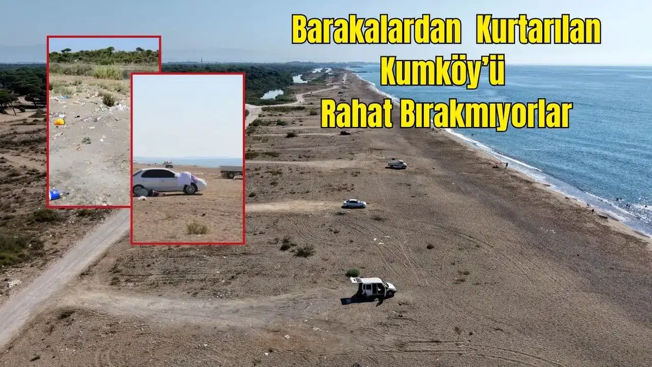 Sahilin tamamının kirli olduğu Kumköy'de kurallara uymayanlarla ilgili denetimlerin yapılması ve çevreyi kirletenlere, kumsala araç girişini ihlal edenlere, caretta yuvaları üzerine araç park edenlere yönelik gerekli cezaların verilmesi isteniyor.