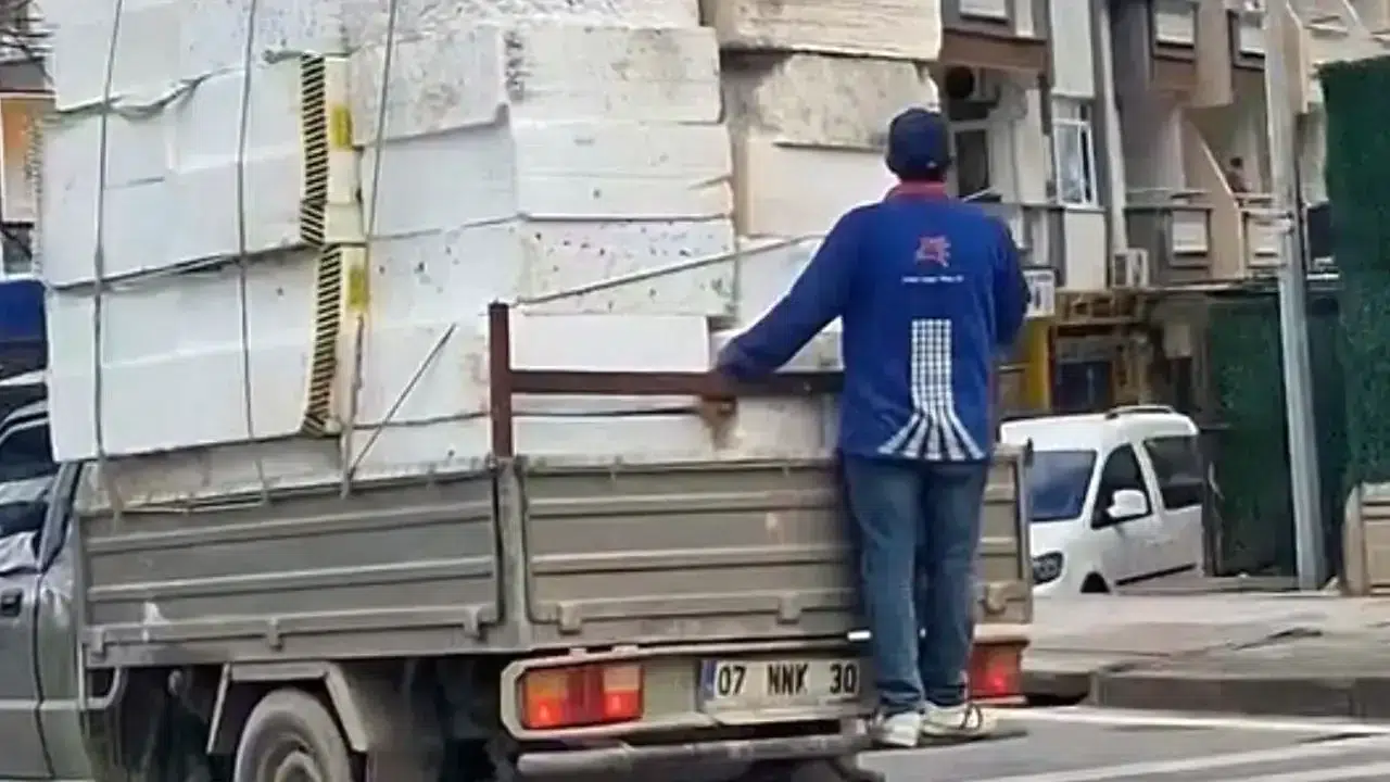 Alanya’nın Tosmur Mahallesi’nde, trafikte seyir halindeki inşaat malzemesi yüklü bir kamyonetin arka kısmına tutunan bir kişi, dakikalarca bu şekilde yolculuk yaptı. Çevredeki sürücülerin şaşkın bakışları arasında devam eden bu tehlikeli anlar, bir vatandaşın cep telefonu kamerasına anbean yansıdı. Görüntülerde, şahsın ayakta durarak kamyonetin kasasından destek aldığı ve hızla ilerleyen araçta düşme riskine aldırış etmediği göze çarptı.