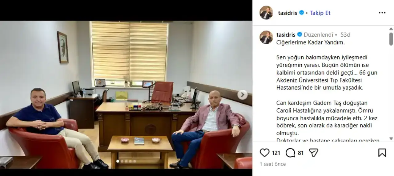 AGC Başkanı İdris Taş, kardeşinin vefatını sosyal medya hesabından yaptığı duygusal bir paylaşımla duyurdu. Taş, "Ciğerlerime kadar yandım. Sen yoğun bakımdayken iyileşmedi yüreğimin yarası. Bugün ölümün ise kalbimi ortasından deldi geçti… 66 gün Akdeniz Üniversitesi Tıp Fakültesi Hastanesi’nde bir umutla yaşadık. Can kardeşim Gadem Taş doğuştan Caroli Hastalığına yakalanmıştı. Ömrü boyunca hastalıkla mücadele etti. 2 kez böbrek, son olarak da karaciğer nakli olmuştu. Doktorlar ve hastane çalışanları gereken tüm özveriyi gösterdi ama kaderin önüne geçilmiyor. Göğüs kafesimde çırpınan sözler var ama senin ardından yazı yazmaya gücüm yetmiyor… Yarın Manavgat Beşkonak Yardibi mevkiinde ikindi namazına müteakip sonsuzluğa uğurlayacağız" dedi.