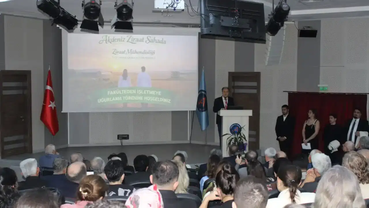 Törenin açılışında konuşan Ziraat Fakültesi Dekanı Prof. Dr. Mustafa Erkan, bölgedeki yoğun yağıştan etkilenen çiftçilere geçmiş olsun dileklerini iletti. Tarımsal üretimin kesintiye uğramadan teknolojiyle harmanlanarak tüketiciye ulaştırılmasında ziraat mühendislerinin kilit rol oynayacağı vurgulandı. Toplam 225 öğrencinin sahaya çıkacağını belirten Erkan; 42 öğrencinin Antalya dışına, 1 öğrencinin ise Erasmus kapsamında Polonya’ya uğurlandığını açıkladı. Eğitimin özel sektör ayağına ilişkin değerlendirmeleri Antalya Ticaret ve Sanayi Odası (ATSO) Başkan Yardımcısı Hakan Pakalın yaparken; Antalya Ziraat Mühendisleri Odası Şube Başkanı Ebru Kaçın ise mezuniyet sonrası ödüller hakkında bilgi paylaştı.