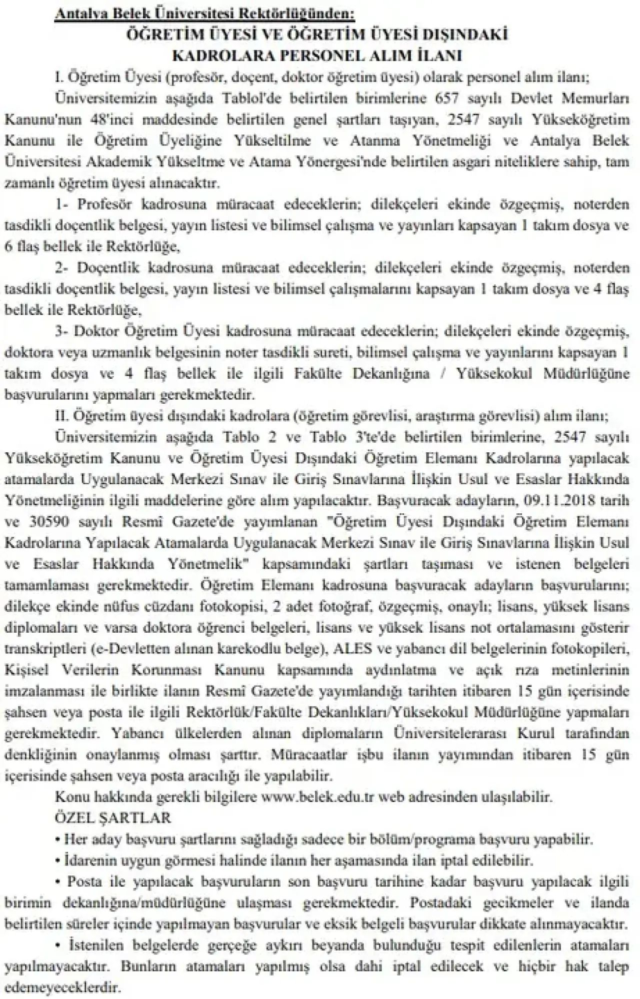 Antalya’nın Alanya ilçesinde bulunan Antalya Belek Üniversitesi, akademik kadrosunu genişletmek amacıyla yeni bir personel alım ilanı yayımladı.