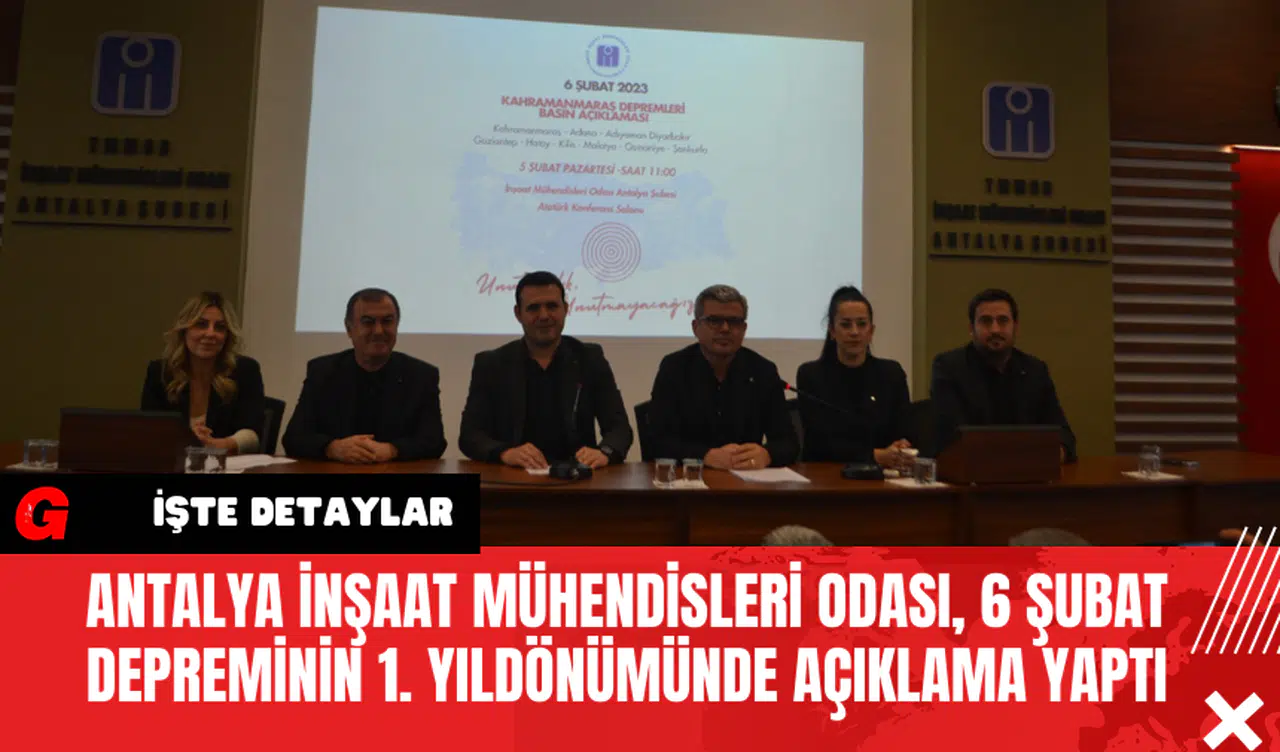 İnşaat Mühendisleri Odası (İMO) Antalya Şubesi, 6 Şubat depreminin 1. yıldönümünde bir basın açıklaması düzenledi. İMO Antalya Şube Yönetim Kurulu üyesi Engin Yergök, aynı ihmaller nedeniyle bir daha aynı acıları yaşamamak için kaybedecek tek bir günümüzün bile olmadığını belirtti.