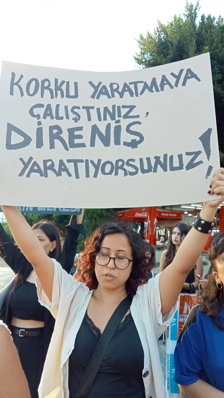 Kadriye Tuğcu, “Semih Çelik isimli erkek 19 yaşında Ayşenur Halil ve İkbal Uzuner adlı iki genç kadını, İstanbul’un ortasında katletti. Beyoğlu’nda bir kadını taciz eden iki erkek fail gözaltına alınıp serbest bırakıldı tepkiler üzerine tutuklandı. Aile ve Sosyal Hizmetler Bakanlığı Mahinur Özdemir Göktaş, katledilen kadınların ardından ‘sıfır tolerans’ diyor. Buradan soruyoruz, İstanbul Sözleşmesini fesh edip 6284 sayılı yasayı tartışmaya açmak failleri cezasızlıkla ödüllendirmek mi sizin sıfır tolerans dediğiniz? Kadınların nasıl doğum yapacağına müdahale edip bedenlerini denetim altına almaya çalışmak mı? Siz konuştukça biz ölüyoruz. Kadın düşmanı iktidarınız her gün bizi ölüme, şiddete mahkum ediyor. Hayatlarımızı size teslim etmeyeceğiz. İşte buradayız. Faillerden, kadın düşmanı iktidarınızdan hesap soruyoruz” diye konuştu.