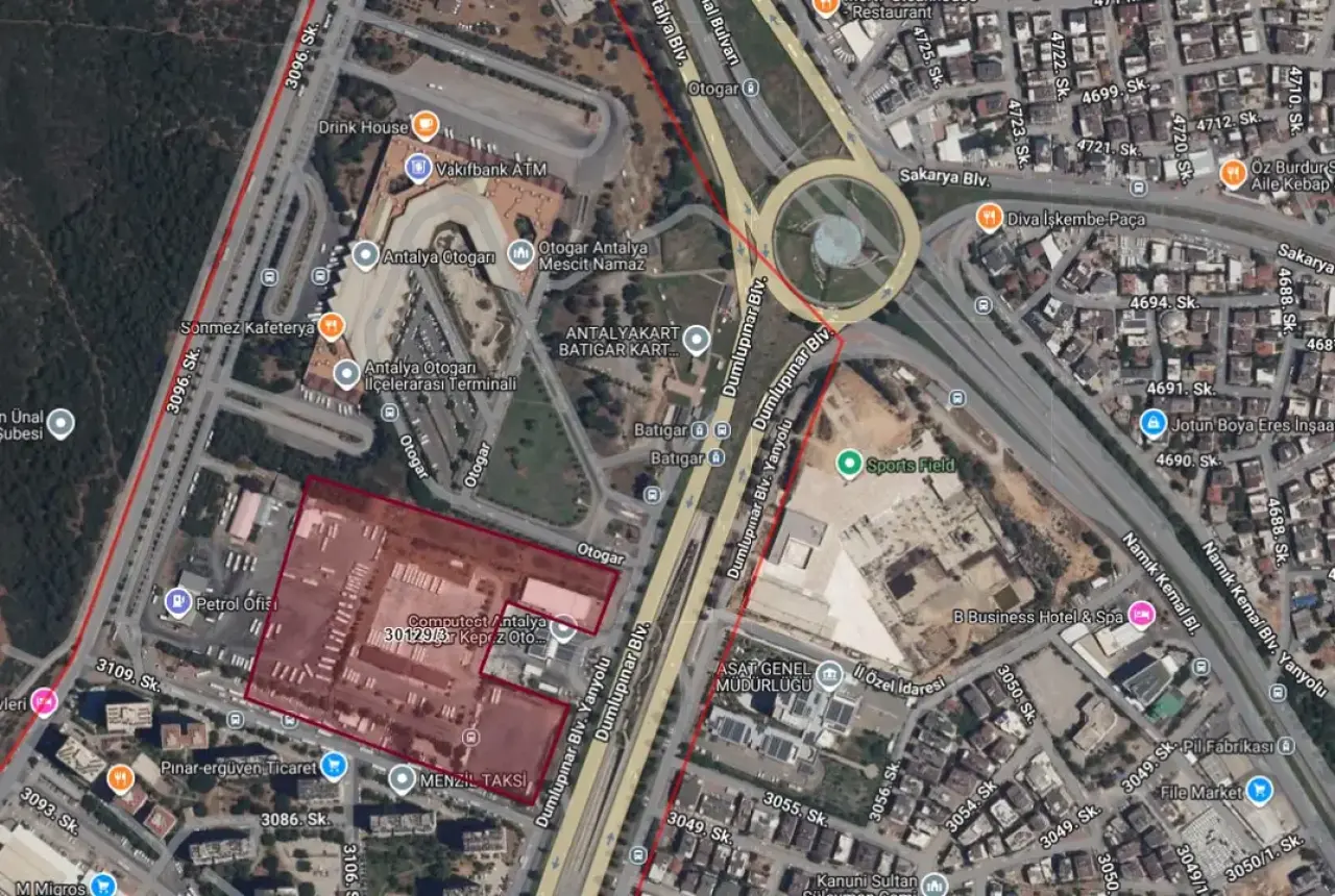 Antalya Şehirlerarası Otobüs Terminali'nin yanında, 30129 ada 3 parsel numarasında kayıtlı olan ve toplam 45 bin 16 metrekarelik alanı kapsayan dev arsa ihaleye çıkıyor. Resmi Gazete'nin 24 Nisan 2026 tarihli sayısında yayımlanan ilana göre; otobüs park alanı olarak kullanılan bu alan 4 milyar 900 milyon TL başlangıç bedeliyle satışa sunuldu. Taşınmazın 15 kat, 1.20 emsali bulunan ticari alan olduğu öğrenildi.
