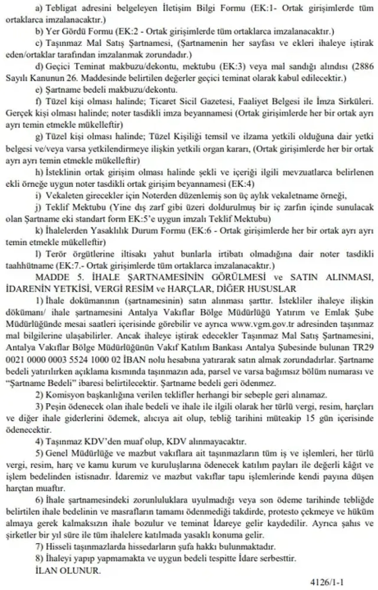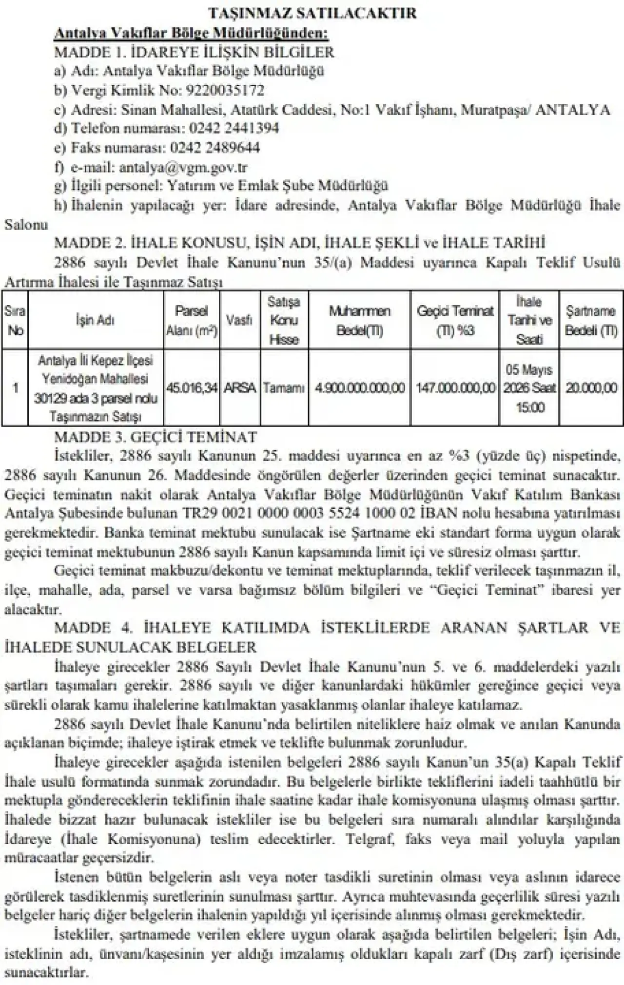 Vakıflar Bölge Müdürlüğü, ihalenin 5 Mayıs 2026 tarihinde saat 15.00’te Antalya Vakıflar Bölge Müdürlüğü İhale Salonu’nda yapılacağını açıkladı.