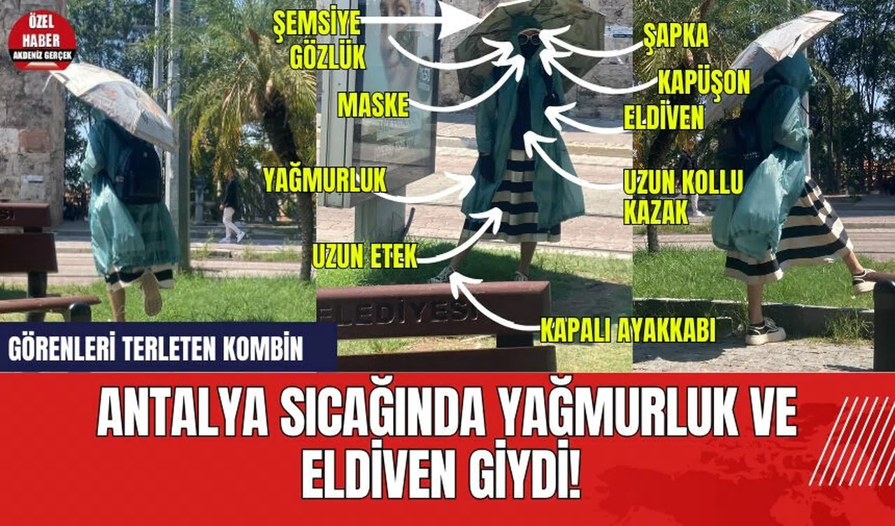 Antalya’da sıcak hava termometreleri patlattı. 45 dereceyi bulan sıcaklıkları, yüzde 90’a varan nem oranı takip etti. Antalya sıcağına karşı önlem almak isteyen vatandaşlar tam kapatmaya geçti. Antalya Kapalı Yol’da görüntülenen bir turistin sıcaktan korunma şekli görenleri terletti.