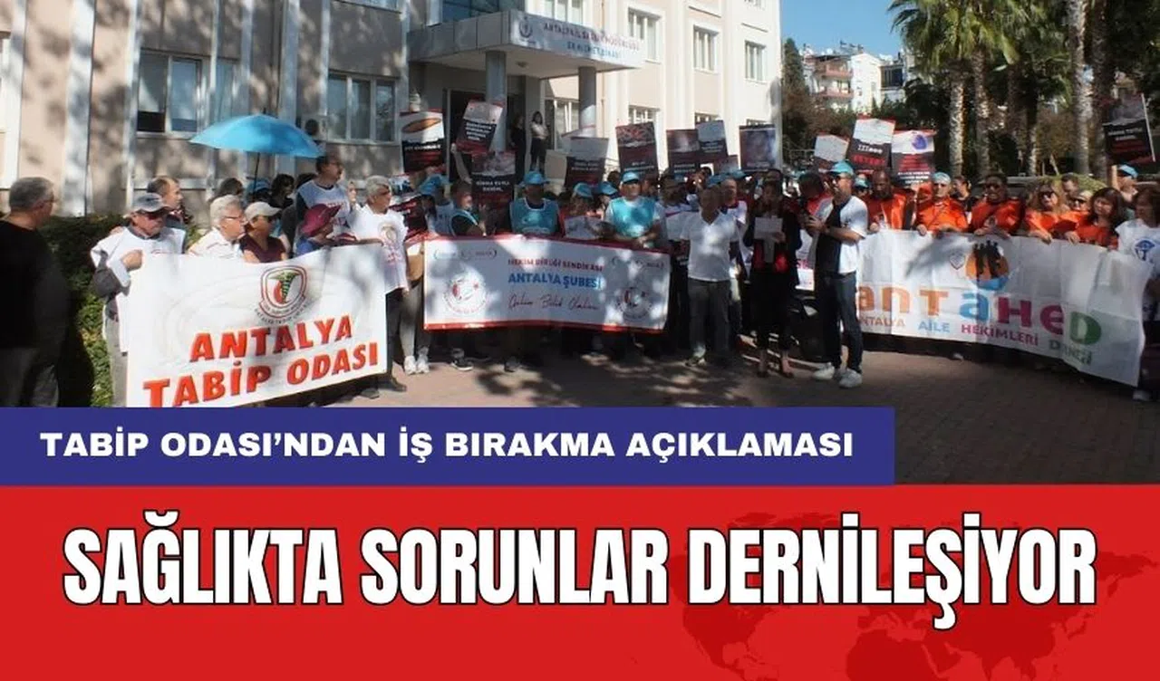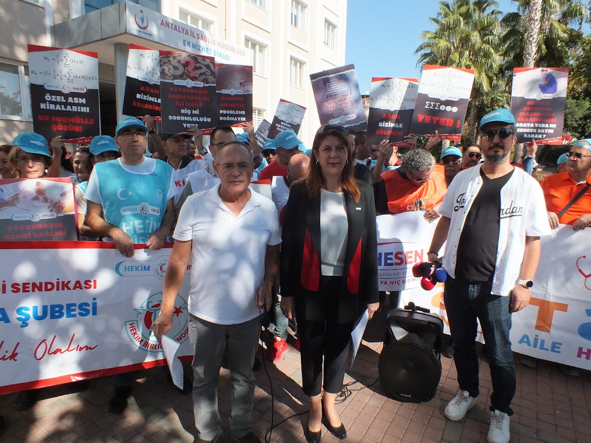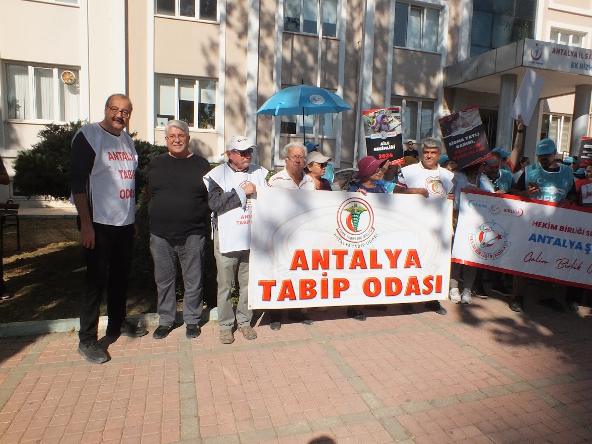 Sağlık Bakanlığı tarafından Aile Hekimliği Ödeme Sözleşme Yönetmeliği’nde yapılan düzenlemeye karşı Türk Tabipleri Birliği (TTB) sağlık sendikaları ve dernekleri ile Antalya İl Sağlık Müdürlüğü önünde açıklama yaptı. Antalya Tabip Odası Başkanı Dr. Hüseyin Can Ertürk tarafından gerçekleştirilen basın açıklamasında iş bırakma eylemine başladı. Açıklamaya ve iş bırakma eylemine Aile Hekimleri Dernekleri Federasyonu (AHEF), Aile Hekimliği Çalışanları Sendikası (AHESEN), Aile Sağlığı Çalışanları Ebe Ve Hemşire Dernekleri Federasyonu (ASEF), Birinci Basamak Sağlık Çalışanları Birlik ve Dayanışma Sendikası (BDS), Genel Sağlık ve Sosyal Hizmet Kolu Kamu Çalışanları Sendikası (Genel Sağlık İş), Hekim Birliği Sağlık ve Sosyal Hizmetler Çalışanları Sendikası (Hekim Birliği), Hekim ve Diğer Sağlık Çalışanları Kamu Sağlık ve Sosyal Hizmetler Sendikası (Hekimsen), Hürriyetçi Sağlık ve Sosyal Hizmetler Çalışanları Sendikası (Hürriyetçi Sağlık Sen), Sağlık ve Sosyal Hizmet Emekçileri Sendikası (SES), Tabip ve Diğer Sağlık Çalışanları Sağlık ve Sosyal Hizmetler Kamu Görevlileri Sendikası (Tabip Sen), Tüm Radyoloji Teknisyenleri ve Teknikerleri Derneği (TÜMRAD-DER), Türk Tabipleri Birliği (TTB), Türkiye Aile Hekimleri Uzmanlık Derneği ( TAHUD) destek verdi.