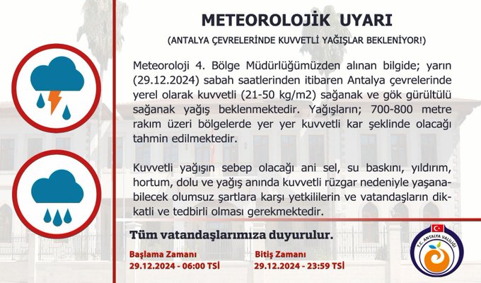 Meteoroloji 4. Bölge Müdürlüğü’nden alınan bilgilere göre, 29 Aralık 2024 sabah saatlerinden itibaren Antalya çevrelerinde yerel olarak 21-50 kg/m² miktarında sağanak ve gök gürültülü sağanak yağış bekleniyor. Yüksek kesimlerde, 700-800 metre rakım üzerindeki bölgelerde ise kuvvetli kar yağışı tahmin ediliyor.