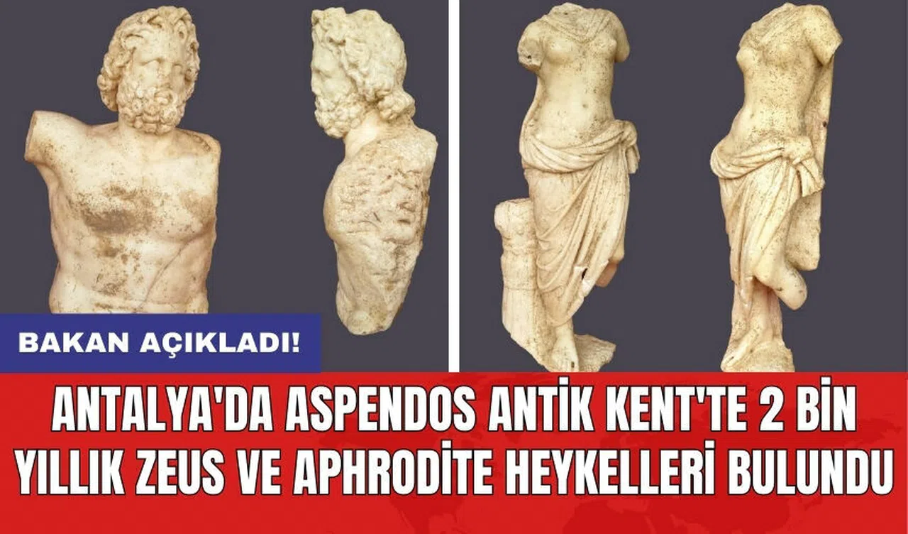 Kültür ve Turizm Bakanı Mehmet Nuri Ersoy, Antalya'nın tarih kokan Aspendos Antik Kenti'nde gerçekleştirilen kazı çalışmalarında Roma İmparatorluğu Dönemi'ne ait 2 bin yıllık Zeus ve Aphrodite heykellerinin bulunduğunu açıkladı.