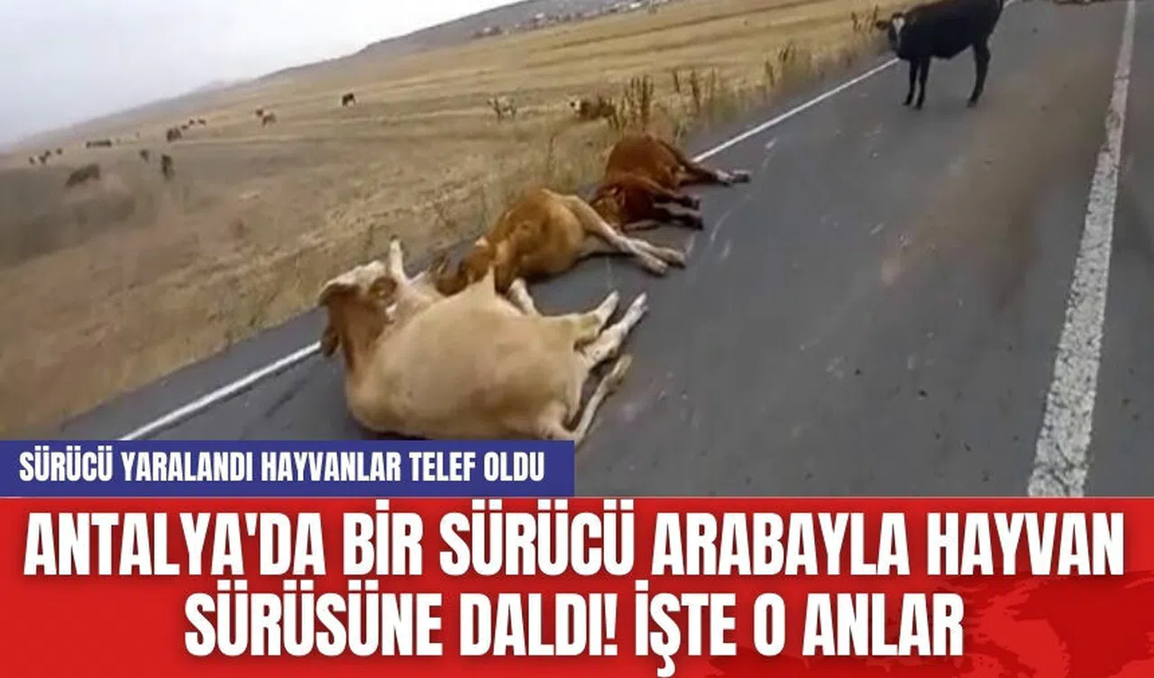 Antalya'nın İbradı ilçesinde otomobilin büyükbaş hayvanlara çarptığı kazada sürücü yaralandı, 3 hayvan telef oldu. Yiğitcan Alper'in kullandığı 06 GD 7074 plakalı otomobil, Beyşehir-Antalya kara yolu Başlar Mahallesi yakınlarında büyükbaş hayvanlara çarptı. Kazada, sürücü yaralandı, 3 büyükbaş hayvan telef oldu. Yaralı, 112 Acil Sağlık ekibince Akseki Devlet Hastanesi'ne götürüldü. Telef olan hayvanlar, kepçe yardımıyla yoldan kaldırıldı.