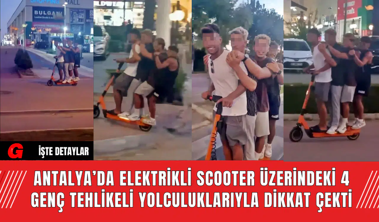 Antalya'nın Aksu ilçesinde, 4 kişinin elektrikli scooter üzerinde gerçekleştirdiği tehlikeli yolculuk, cep telefonuyla kaydedildi. Görüntüler, gençlerin hem kendi hem de trafikteki diğer kişilerin güvenliğini tehlikeye attığını ortaya koydu.