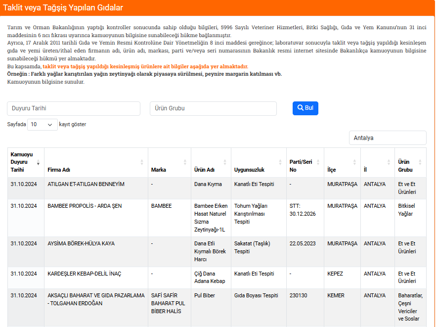 Geçtiğimiz günlerde gıda sahteciliği nedeniyle 14 firmayı kamuoyuna ifşa eden Tarım ve Orman Bakanlığı, Antalya’da faaliyet gösteren 5 firmayı daha listeye ekledi. 5996 Sayılı Veteriner Hizmetleri, Bitki Sağlığı, Gıda ve Yem Kanunu kapsamında gerçekleştirilen denetimlerde, bu firmaların ürünlerinde hileli içerikler tespit edildi.