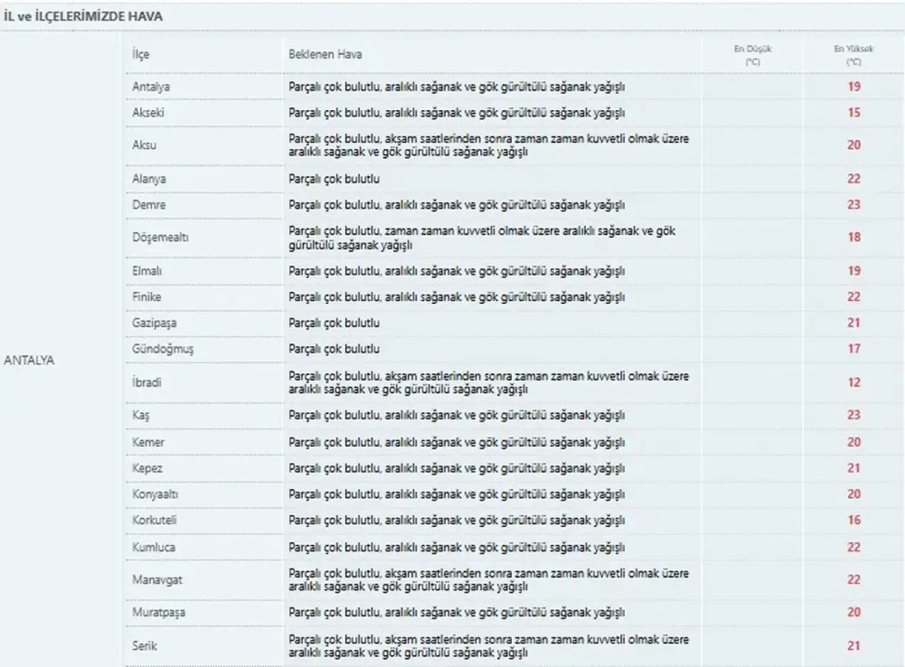 Elmalı – Parçalı çok bulutlu, aralıklı sağanak ve gök gürültülü sağanak yağışlı | En düşük: 19°C