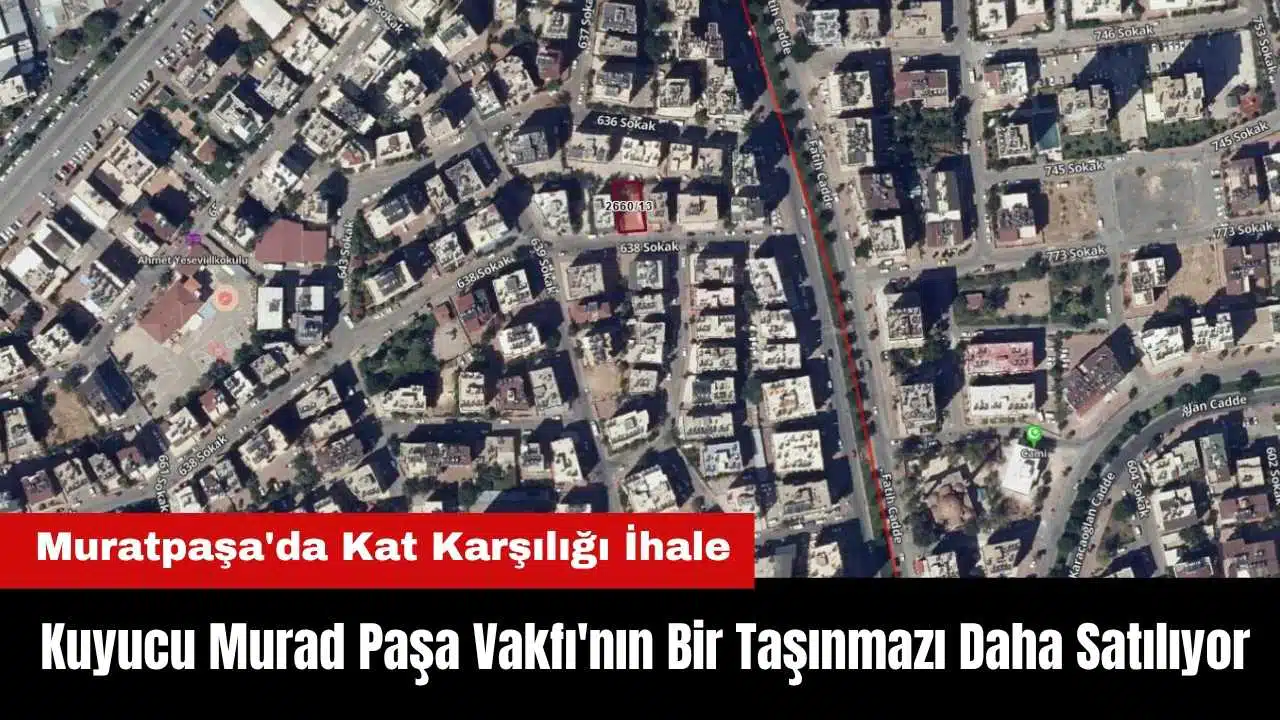 Antalya Vakıflar Bölge Müdürlüğü, Sadrazam Kuyucu Murad Paşa Bin Abdüsselam Vakfı’na ait bir taşınmazı kat karşılığı satışa çıkardığını duyurdu. Resmi Gazete'nin 17 Temmuz 2025 tarihli sayısında yayımlanan ilana göre; Cumhuriyet Mahallesi 2660 ada, 13 parselde kayıtlı 317 metrekarelik arsa için kat karşılığı inşaat yapım işi ihaleye çıkacak. İhale 12 Ağustos’ta yapılacak.