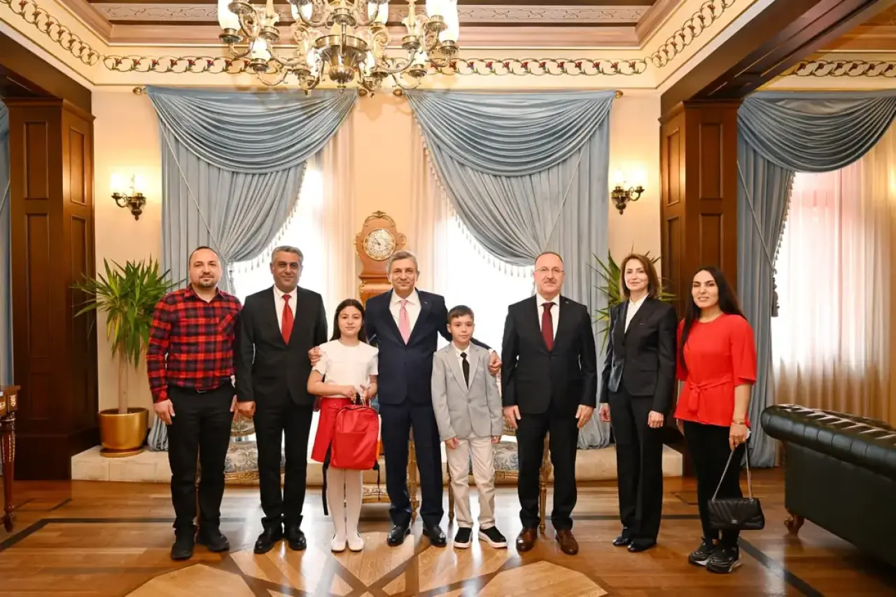 Antalya Valisi Hulusi Şahin, güzel dilekleri ve konuşması için Çocuk Vali Nazenin Karsavurdan'ı tebrik etti ve kitap seti ile kırtasiye malzemeleri hediye etti.