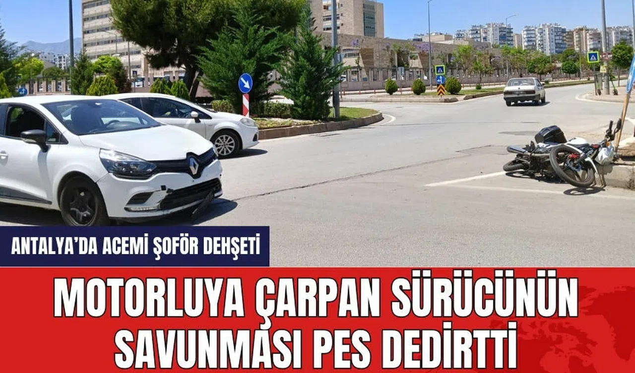 Antalya Konyaaltı mevkide dönel kavşakta kaza meydana geldi. Motorluya çarpan araç sürücüsünün savunması pes dedirtti.