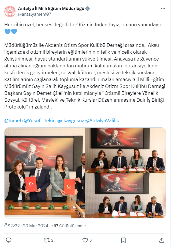 İl Milli Eğitim Müdürlüğü X(Twitter) hesabından 'Her zihin özel, her ses değerlidir. Otizmin farkındayız, onların yanındayız' başlıklı yapılan paylaşımda, 'Müdürlüğümüz ile Akdeniz Otizm Spor Kulübü Derneği arasında, Aksu ilçemizdeki otizmli bireylerin eğitimlerinin nitelik ve nicelik olarak geliştirilmesi, hayat standartlarının yükseltilmesi, Anayasa ile güvence altına alınan eğitim haklarından mahrum kalmamaları, potansiyellerini keşfederek geliştirmeleri, sosyal, kültürel, mesleki ve teknik kurslara katılımlarının sağlanarak topluma kazandırılmaları amacıyla İl Milli Eğitim Müdürümüz Sayın Salih Kaygusuz ile Akdeniz Otizm Spor Kulübü Derneği Başkanı Sayın Demet Çileli‘nin katılımlarıyla 'Otizmli Bireylere Yönelik Sosyal, Kültürel, Mesleki ve Teknik Kurslar Düzenlenmesine Dair İş Birliği Protokolü' imzalandı' ifadelerine yer verdi.