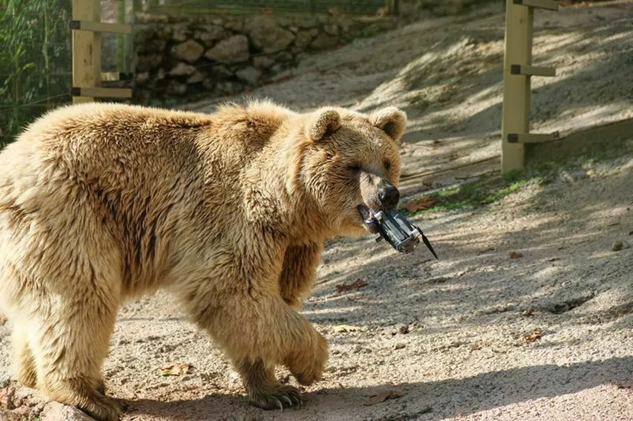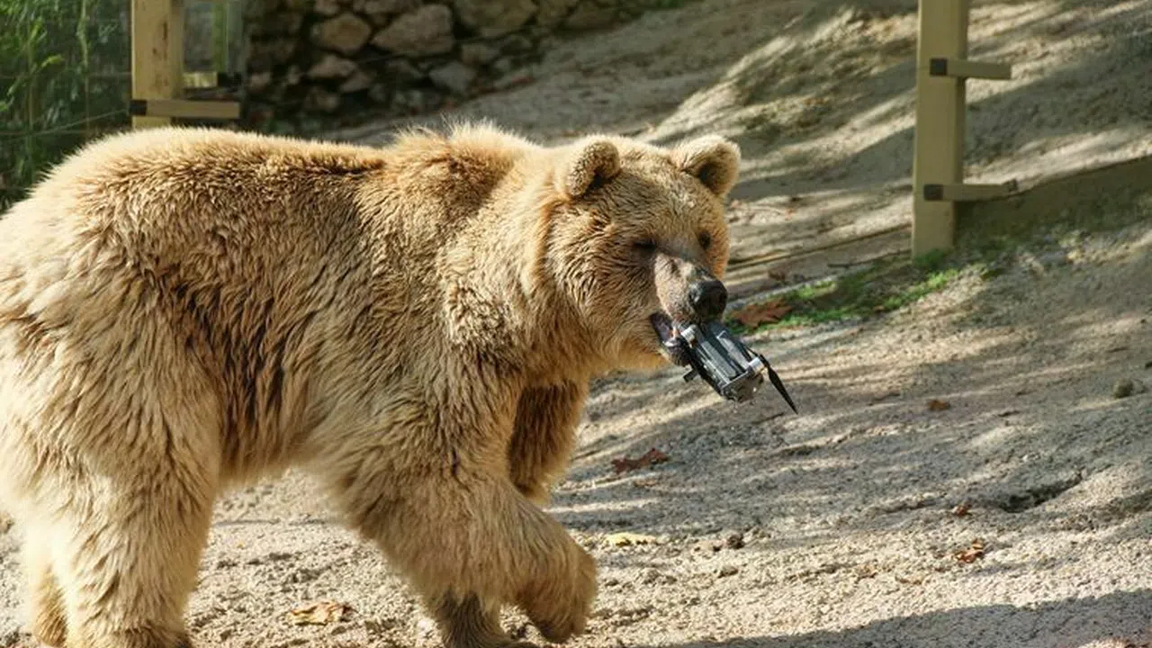 Ancak, teknik bir arıza nedeniyle dronun seyrine beklenmedik bir hikaye eklenmiş oldu. Dron, önce ağaca çarptıktan sonra boz ayıların keyifle su havuzunda vakit geçirdiği alana düştü. Olayı fark eden boz ayılardan biri, hızla havuza girerek dronu ağzında sudan çıkardı ve ardından kafesine taşıdı.