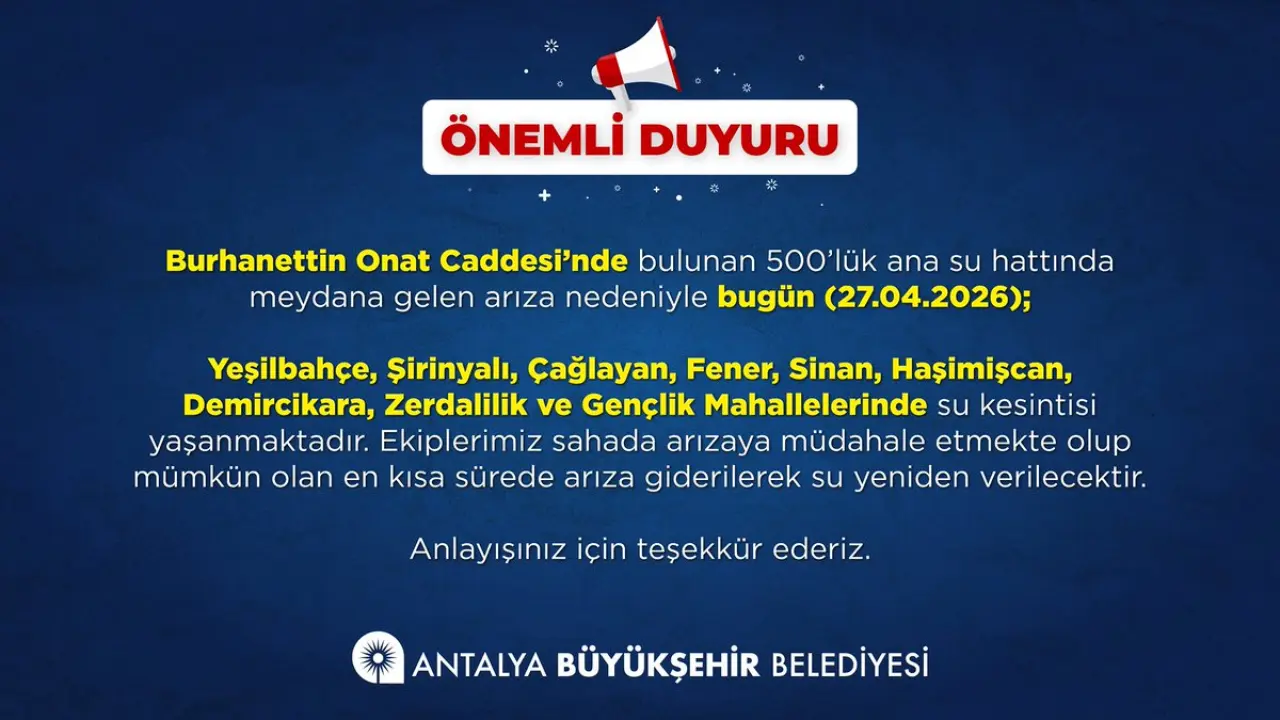 Antalya Büyükşehir Belediyesi, bugün (27.04.2026) yaptığı duyuruyla; Yeşilbahçe, Şirinyalı, Çağlayan, Fener, Sinan, Haşimişcan, Demircikara, Zerdalilik ve Gençlik mahallelerinde su kesintisi yaşandığını açıkladı. Ancak bu mahalle sakinleri benzer bir senaryoyu geçtiğimiz günlerde de yaşamıştı. Son dönemde sıklaşan ve "ana hat arızası" olarak gerekçelendirilen kesintilerin, geçtiğimiz haftalarda 24 saati bulan sürelerde giderilememesi, bölge halkının sabrını taşırdı.