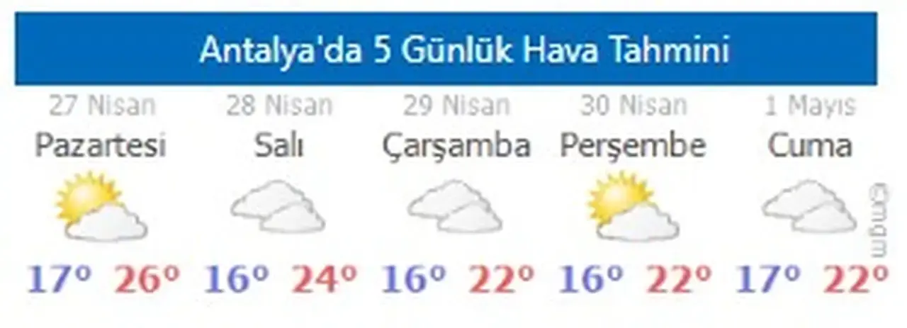 Resmi sitede yayımlanan 5 günlük Antalya hava durumu tahminlerine göre ise özellikle 27 Nisan Pazartesi gününden itibaren hafta boyunca kentin farklı noktalarında değişkenlik gösteren hava olayları görülecek. Sahil şeridinde parçalı bulutlu bir gökyüzü hakimken, yüksek kesimlerde ve iç ilçelerde sağanak yağışların etkisini hissettirmesi bekleniyor.