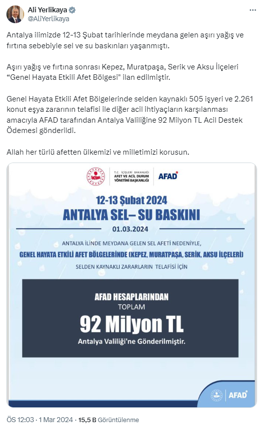 Türkiye Cumhuriyeti İçişleri Bakanı Ali Yerlikaya sosyal medya aracılığıyla paylaşımında "Antalya ilimizde 12-13 Şubat tarihlerinde meydana gelen aşırı yağış ve fırtına sebebiyle sel ve su baskınları yaşanmıştı. Aşırı yağış ve fırtına sonrası Kepez, Muratpaşa, Serik ve Aksu İlçeleri “Genel Hayata Etkili Afet Bölgesi" ilan edilmiştir. Genel Hayata Etkili Afet Bölgelerinde selden kaynaklı 505 işyeri ve 2.261 konut eşya zararının telafisi ile diğer acil ihtiyaçların karşılanması amacıyla AFAD tarafından Antalya Valiliğine 92 Milyon TL Acil Destek Ödemesi gönderildi. Allah her türlü afetten ülkemizi ve milletimizi korusun." açıklamasında bulundu.