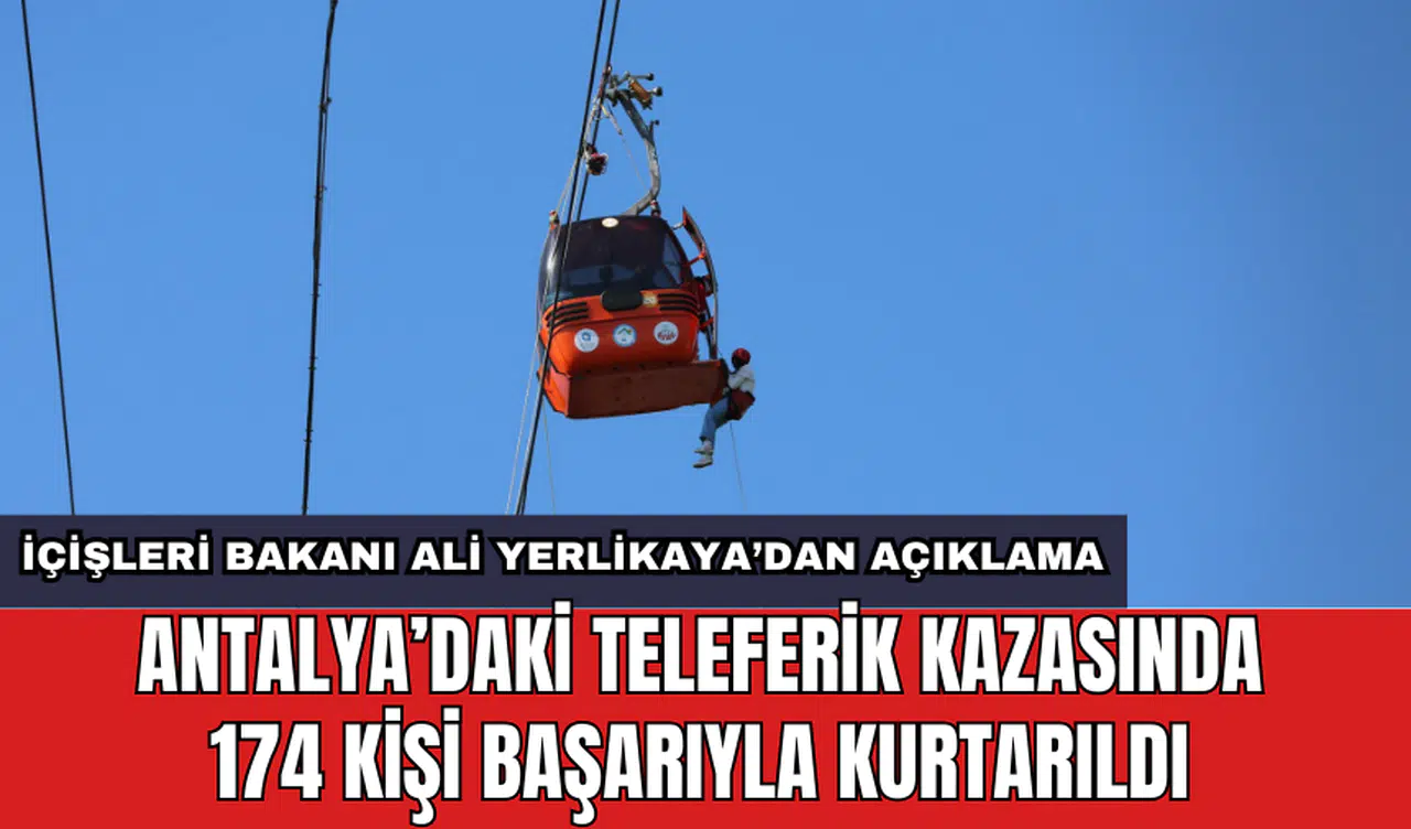 İçişleri Bakanı Ali Yerlikaya, Antalya Konyaaltı’nda Sarısu teleferik hattında meydana gelen kazada 1 vatandaşın hayatını kaybettiğini, 7 vatandaşın yaralandığını ve 174 kişinin başarıyla kurtarıldığını açıkladı.