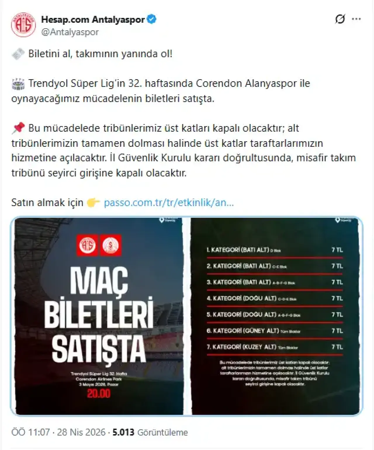 Kulübün sosyal medya hesabından yapılan duyuruda maç biletlerinin 7 TL olduğu belirtilip, Biletini al, takımının yanında ol! Trendyol Süper Lig’in 32. haftasında Corendon Alanyaspor ile oynayacağımız mücadelenin biletleri satışta" denildi.