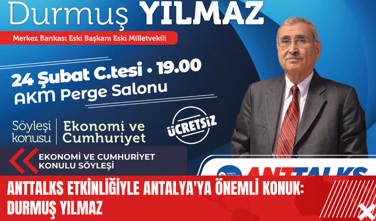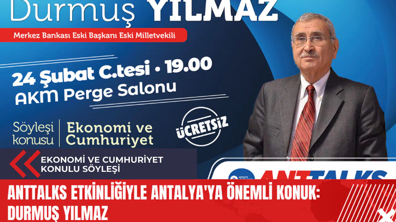 Antalya Büyükşehir Belediyesi tarafından düzenlenen Anttalks etkinliği, Antalyalılarla paylaşmaya değer fikirleri, yaşamları ve deneyimleri buluşturuyor. Bu kez, 'Ekonomi ve Cumhuriyet' konulu söyleşi etkinliğinde, Türkiye Cumhuriyeti Merkez Bankası Eski Başkanı Durmuş Yılmaz, Antalyalılarla bir araya gelecek.