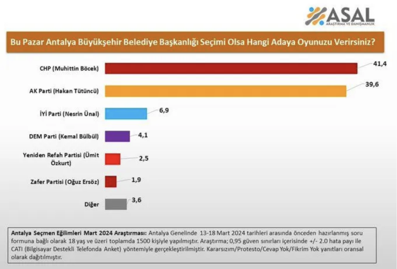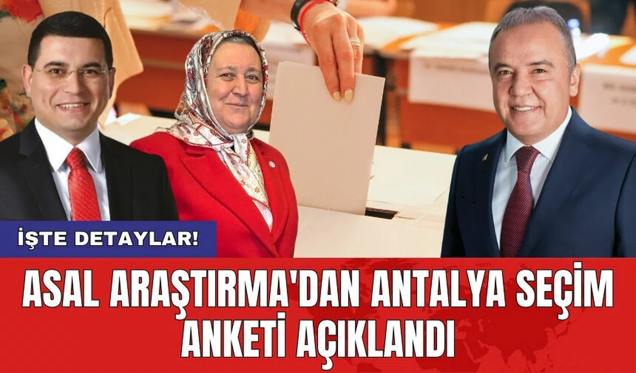 ASAL Araştırma'nın yaptığı ankete göre, Antalya'da CHP adayı seçimde önde gözüküyor. Ankete katılan bin 500 kişinin görüşlerine başvurulan ankette, "Bu pazar Antalya Büyükşehir Belediye Başkanlığı seçimi olsa hangi adaya oyunuzu verirsiniz?" sorusu soruldu.