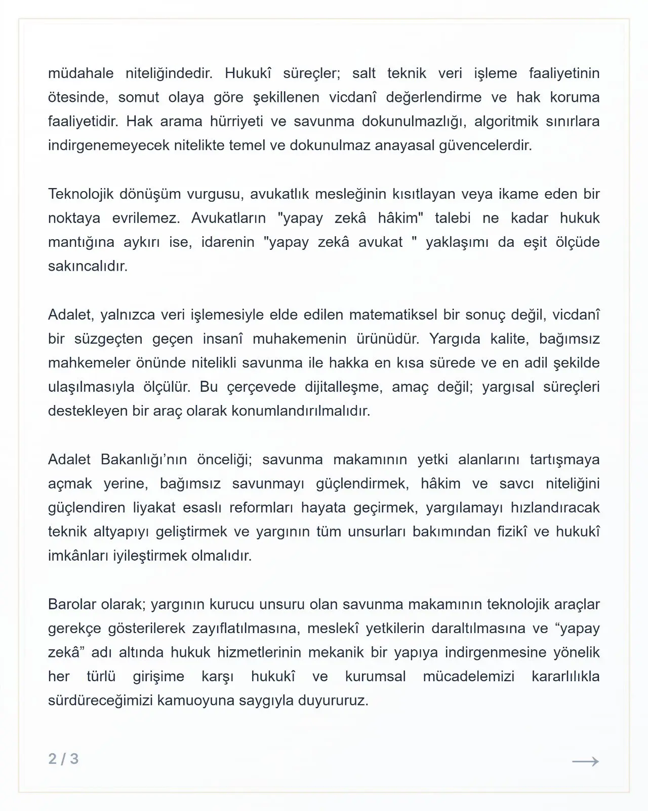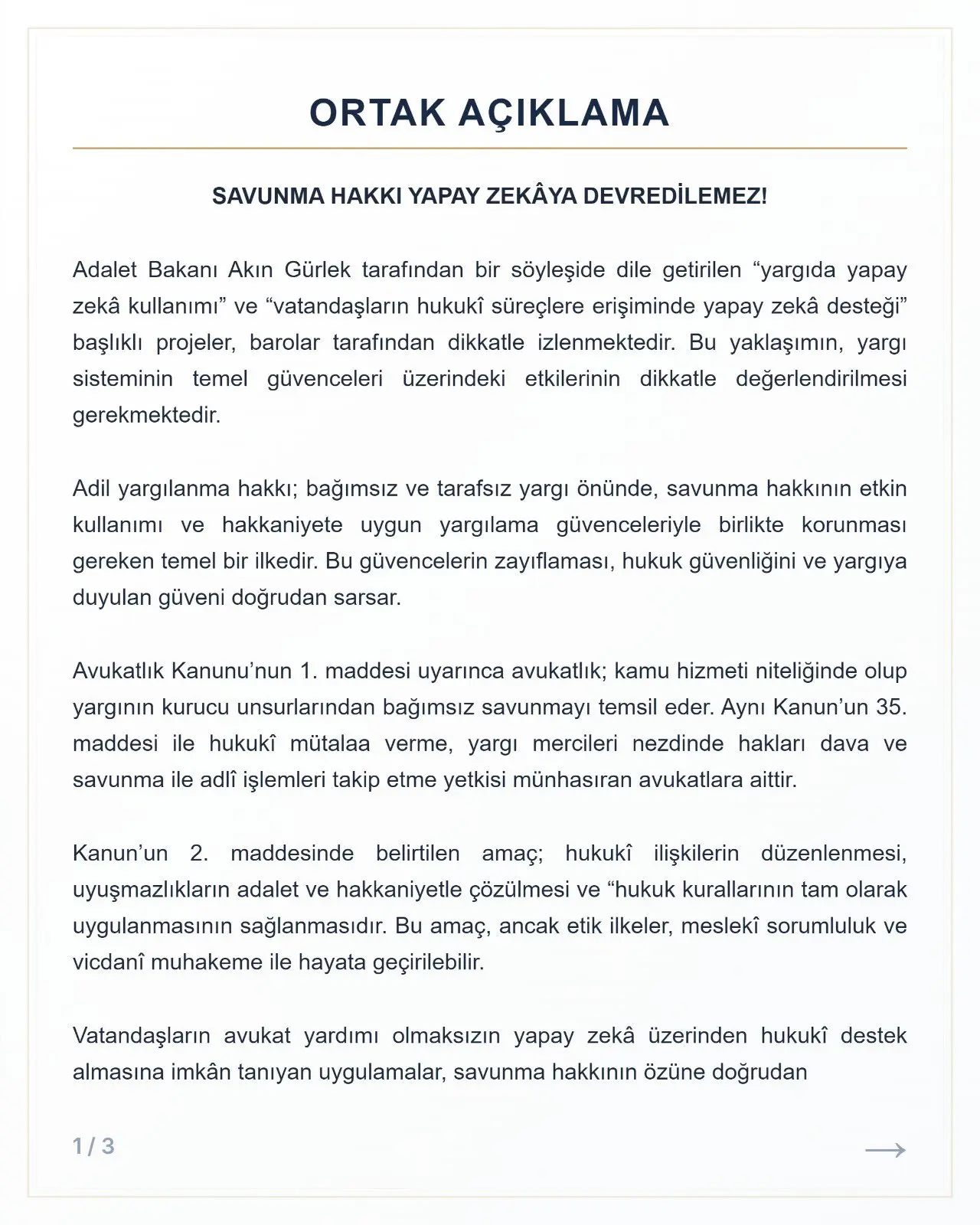 Barolar, avukatlık mesleğinin kamu hizmeti niteliğinde olduğunu ve yargının kurucu unsurlarından biri olan bağımsız savunmayı temsil ettiğini hatırlattı. Açıklamada, avukat yardımı olmaksızın yapay zekâ üzerinden hukuk desteği alınmasının savunma hakkının özüne müdahale olduğu belirtilerek şu ifadelere yer verildi: