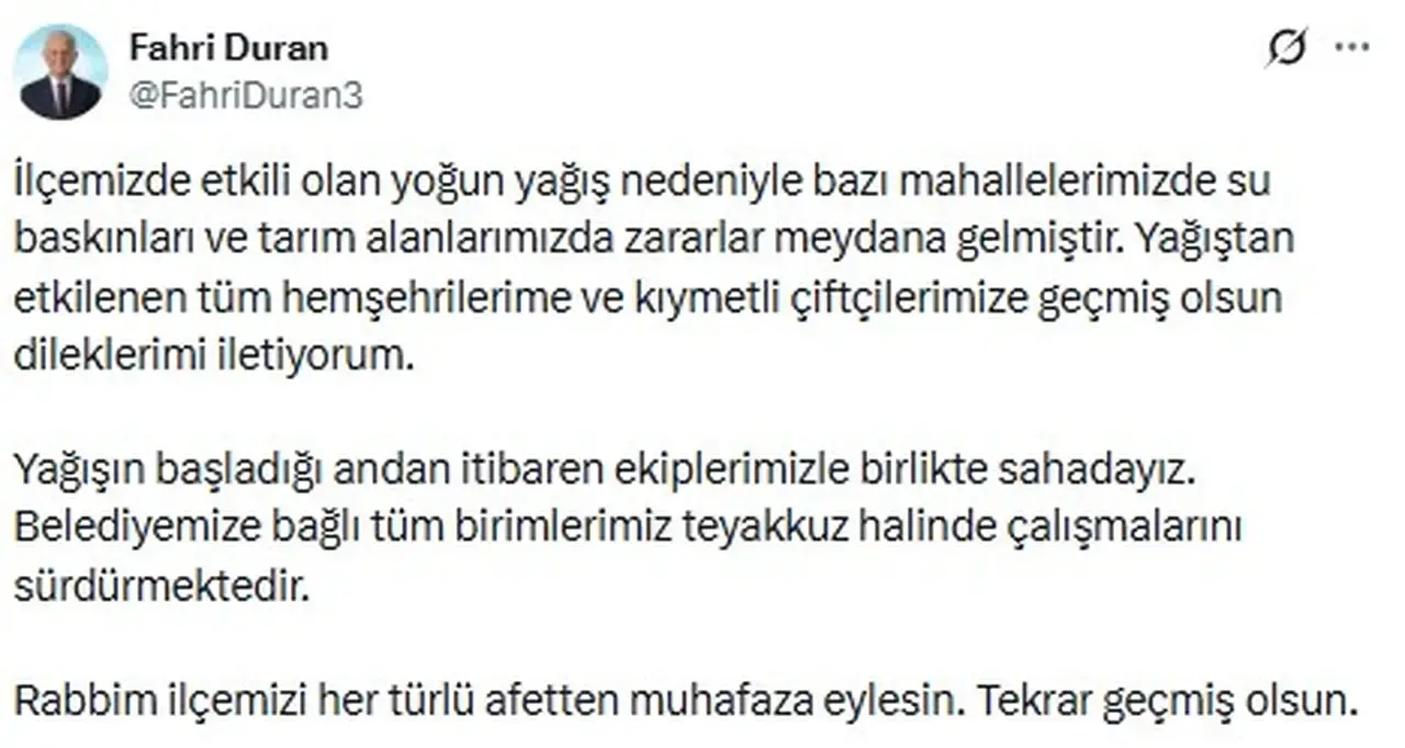 Başkan Duran, "İlçemizde etkili olan yoğun yağış nedeniyle bazı mahallelerimizde su baskınları ve tarım alanlarımızda zararlar meydana gelmiştir. Yağıştan etkilenen tüm hemşehrilerime ve kıymetli çiftçilerimize geçmiş olsun dileklerimi iletiyorum. Yağışın başladığı andan itibaren ekiplerimizle birlikte sahadayız. Belediyemize bağlı tüm birimlerimiz teyakkuz halinde çalışmalarını sürdürmektedir. Rabbim ilçemizi her türlü afetten muhafaza eylesin. Tekrar geçmiş olsun" dedi.