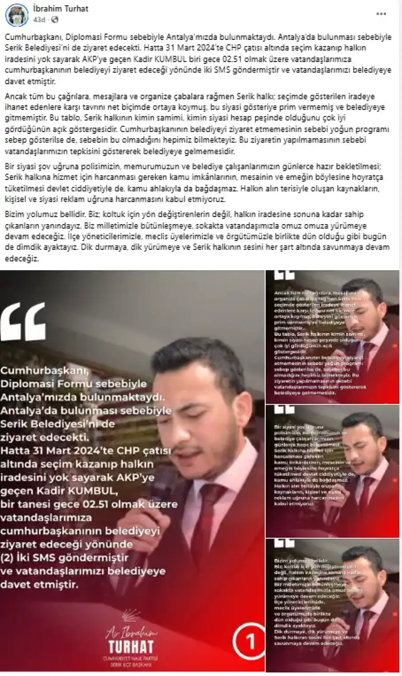 Turhat yaptığı açıklamada, “Cumhurbaşkanı, Diplomasi Formu sebebiyle Antalya’mızda bulunmaktaydı. Antalya’da bulunması sebebiyle Serik Belediyesi’ni de ziyaret edecekti. Hatta 31 Mart 2024’te CHP çatısı altında seçim kazanıp halkın iradesini yok sayarak AKP’ye geçen Kadir Kumbul, biri gece 02.51 olmak üzere vatandaşlarımıza cumhurbaşkanının belediyeyi ziyaret edeceği yönünde iki SMS göndermiştir ve vatandaşlarımızı belediyeye davet etmiştir. Ancak tüm bu çağrılara, mesajlara ve organize çabalara rağmen Serik halkı; seçimde gösterilen iradeye ihanet edenlere karşı tavrını net biçimde ortaya koymuş, bu siyasi gösteriye prim vermemiş ve belediyeye gitmemiştir. Bu tablo, Serik halkının kimin samimi, kimin siyasi hesap peşinde olduğunu çok iyi gördüğünün açık göstergesidir. Cumhurbaşkanının belediyeyi ziyaret etmemesinin sebebi yoğun programı sebep gösterilse de sebebin bu olmadığını hepimiz bilmekteyiz. Bu ziyaretin yapılmamasının sebebi vatandaşlarımızın tepkisini göstererek belediyeye gelmemesidir. Bir siyasi şov uğruna polisimizin, memurumuzun ve belediye çalışanlarımızın günlerce hazır bekletilmesi; Serik halkına hizmet için harcanması gereken kamu imkânlarının, mesainin ve emeğin böylesine hoyratça tüketilmesi devlet ciddiyetiyle de kamu ahlakıyla da bağdaşmaz. Halkın alın teriyle oluşan kaynakların, kişisel ve siyasi reklam uğruna harcanmasını kabul etmiyoruz. Bizim yolumuz bellidir. Biz; koltuk için yön değiştirenlerin değil, halkın iradesine sonuna kadar sahip çıkanların yanındayız. Biz milletimizle bütünleşmeye, sokakta vatandaşımızla omuz omuza yürümeye devam edeceğiz. İlçe yöneticilerimizle, meclis üyelerimizle ve örgütümüzle birlikte dün olduğu gibi bugün de dimdik ayaktayız. Dik durmaya, dik yürümeye ve Serik halkının sesini her şart altında savunmaya devam edeceğiz” dedi.