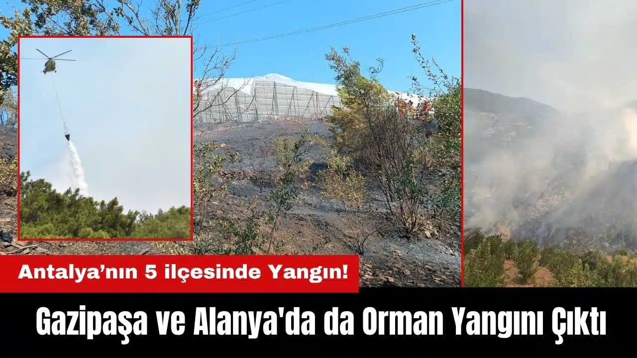 Antalya'nın 5 ilçesinde orman yangınları çıktı. Antalya'nın Aksu, Muratpaşa ve Manavgat ilçelerinin ardından Gazipaşa ve Alanya ilçelerinde de alevler hızla yayıldı. 3 ilçedeki yangınlar kontrol altına alınırken diğer ilçelerde ekiplerin karadan ve havadan müdahaleleri devam ediyor.