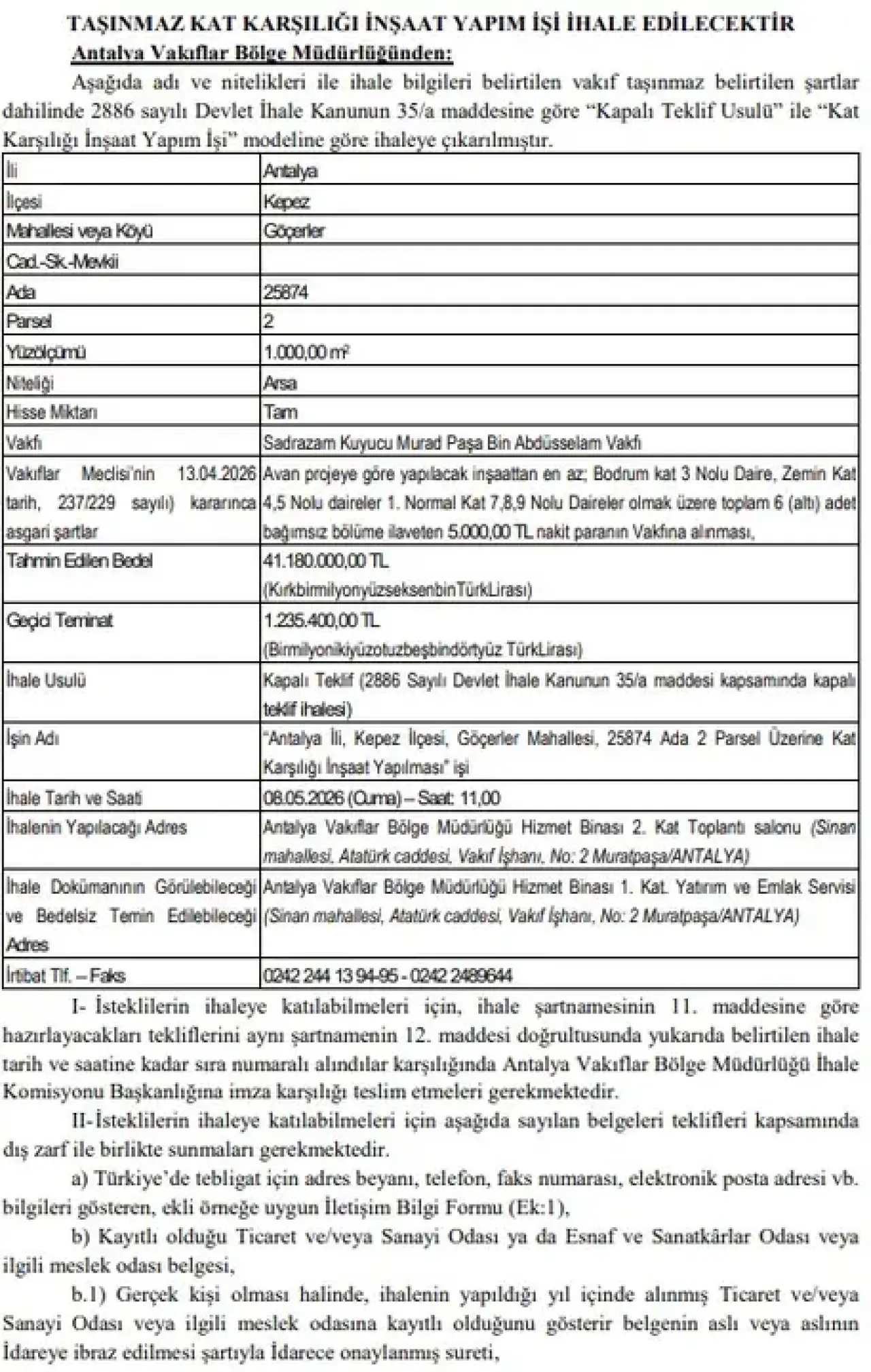 8 Mayıs 2026 Cuma günü saat 11.00’de Muratpaşa’daki Vakıflar İşhanı’nda yapılacak olan ihale için geçici teminat bedeli ise 1 milyon 235 bin 400 TL olarak duyuruldu.