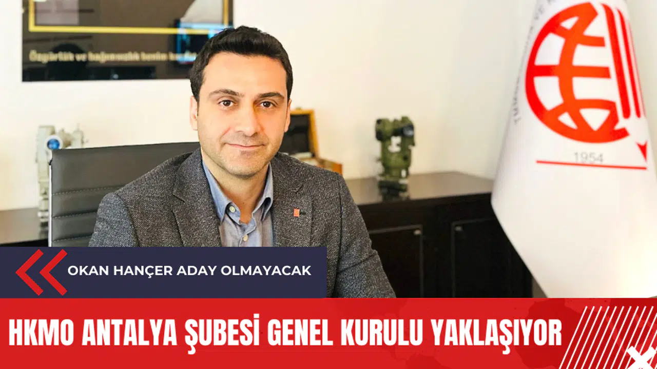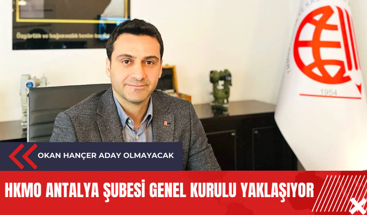 HKMO Antalya Şube Başkanı Okan Hançer yaptığı açıklamada, 'Dört yılı şube başkanlığı olmak üzere, aralıksız 16 yıl 7 dönem görev yaptığım harita ve kadastro mühendisleri odası Antalya Şube yönetim kuruluna 17.dönemde aday olmayacağımı kamuoyunun bilgisine sunarım. Görev sürem boyunca en büyük destekçim olan eşim, kızım ve ailem başta olmak üzere, yönetim kurullarında görev yaptığım tüm yol ve mesai arkadaşlarıma, oda genel merkezimize, desteğini esirgemeyen üye meslektaşlarıma, tüm meslek odası başkanlarıma, sivil toplum örgütü başkan ve temsilcisi kent paydaşlarına, değerli basın emekçilerine, iş birliği ve destekleri için sonsuz teşekkür ediyorum' dedi.