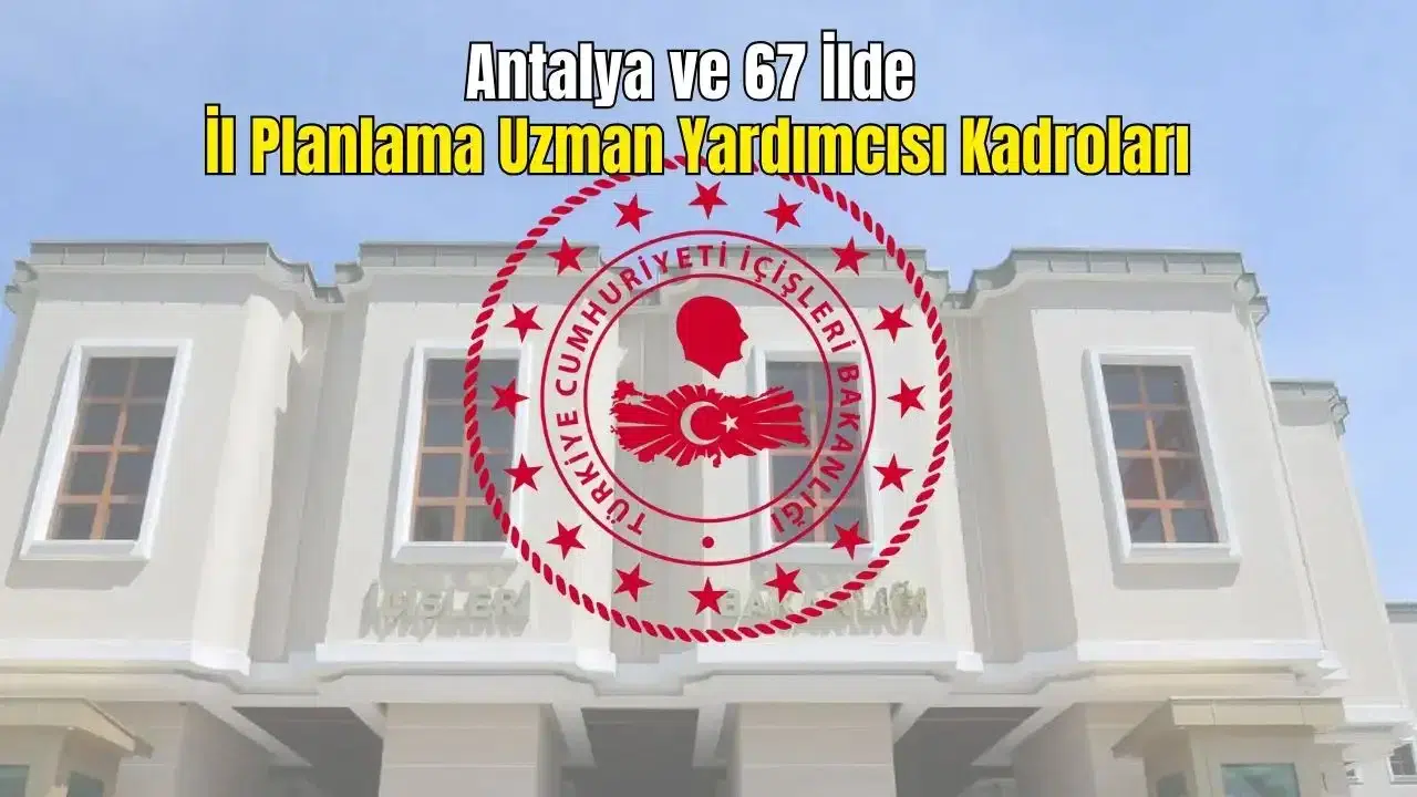 İçişleri Bakanlığı, taşra teşkilatında görev yapmak üzere Antalya dahil 68 ilde toplam 80 İl Planlama Uzman Yardımcısı alımı gerçekleştirecek. Resmi Gazete'nin 19 Aralık 2025 tarihli sayısında yayımlanan ilana başvurular 5-9 Ocak 2026 tarihleri arasında e-Devlet üzerinden yapılacak.