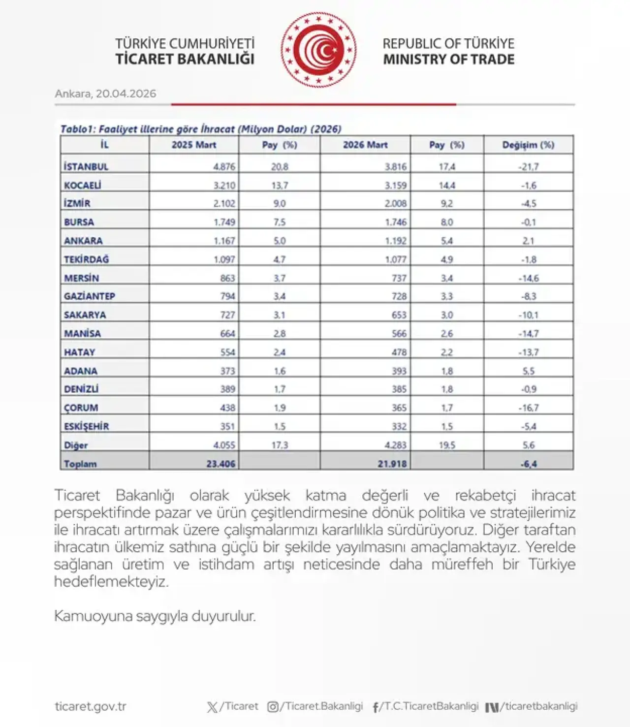 Küresel piyasalardaki hareketliliğin ve 50 gündür devam eden Körfez savaşının olumsuz etkileri ile takvim etkisinin gölgesinde geçen Mart ayında, Türkiye'nin toplam ihracatı 21 milyar 918 milyon dolara ulaştı. Ocak-Mart döneminde ülke genelinde 14 il 1 milyar dolar barajını aşarak devler liginde yerini aldı. İllerin Mart ayı ihracat listesi de Bakanlık tarafından paylaşıldı. Antalya 15 şehirlik bu listede yer bulamadı.