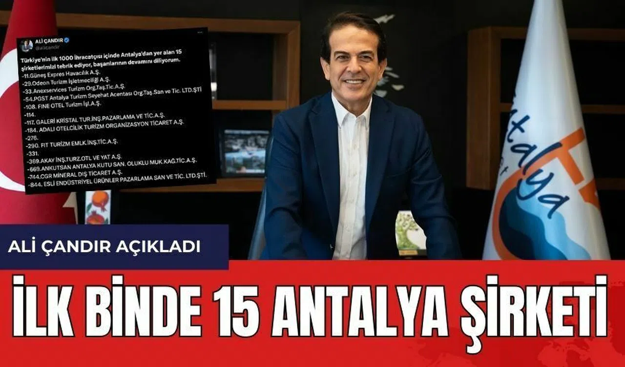 ATB Başkanı Çandır yaptığı açıklamada, “Türkiye’nin ilk 1000 İhracatçısı içinde Antalya'dan yer alan 15 şirketlerimizi tebrik ediyor, başarılarının devamını diliyorum” diyerek 15 şirketi sıraladı: