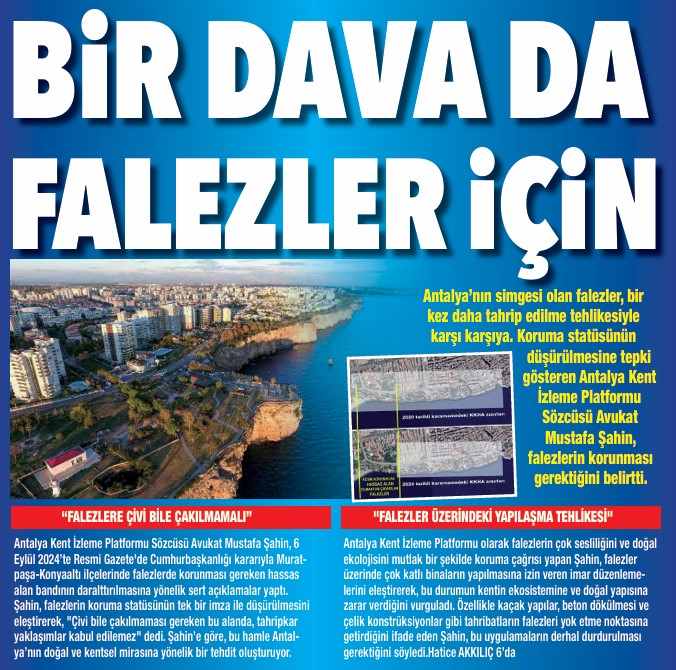 Akdeniz Gerçek'in yıllardır gündeme taşıdığı falezlerde otellerin ve plaj işletmelerinin yarattığı tahribat geri dönülemez noktaya gelmek üzere. Eylül Ayı içerisinde Antalya’da dünyaca ünlü falezlerin 'Kesin Korunacak Hassas Alan' statüsünden 'Nitelikli Doğal Koruma Alanı' statüsüne düşürülmesi sonrası işgalin önü daha da açılmıştı. Çevre, Şehircilik ve İklim Değişikliği Bakanlığı'nın falezler ile ilgili aldığı işgallerin kaldırılması kararından aylar sonra Resmi Gazete'de yayınlanan Cumhurbaşkanı kararnamesiyle falezlerin statüsü düşürülerek günübirlik tesisler, iskele, balıkçı barınağı, su sporları, güneşlenme terası, ahşap iskele, teleferik, telesiyej vb. faaliyetlerin yapılmasının önü açılmıştı. Falezlere çökmeye çalışan kişiler Antalya'nın doğal dokusuna geri dönüşü olmayan zararlar vermeye hazırlanırken kamuoyunda tepkiler büyüyor. Şehir Plancıları Odası Antalya Şubesi’nin davasının ardından bir dava da Jeoloji Mühendisleri Odası Antalya Şubesi’nden geldi.