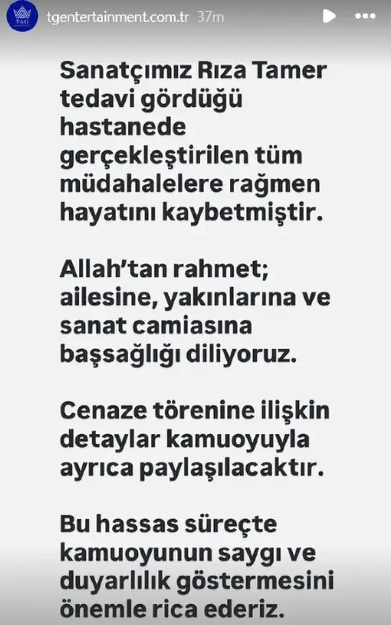 Vefat haberinin duyulmasının ardından sanatçının resmi sosyal medya hesabı üzerinden yapılan açıklamada, "Sanatçımız Rıza Tamer tedavi gördüğü hastanede gerçekleştirilen tüm müdahalelere rağmen hayatını kaybetmiştir. Allah'tan rahmet; ailesine, yakınlarına ve sanat camiasına başsağlığı diliyoruz. Cenaze törenine ilişkin detaylar kamuoyuyla ayrıca paylaşılacaktır. Bu hassas süreçte kamuoyunun saygı ve duyarlılık göstermesini önemle rica ederiz" denildi.