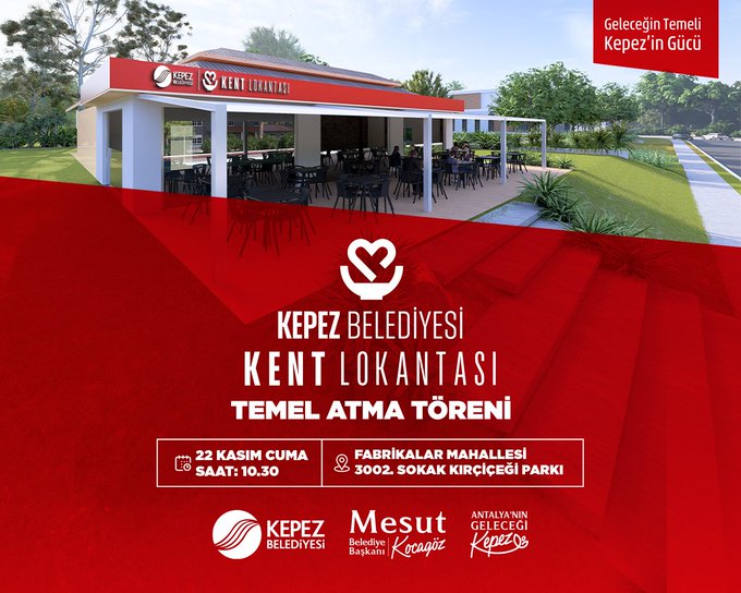 Kepez halk lokantasının temel atma töreni, 22 Kasım Cuma günü saat 10.30’da Fabrikalar Mahallesi, 3002. Sokak Kırçiçeği Parkı’nda gerçekleştirilecek.