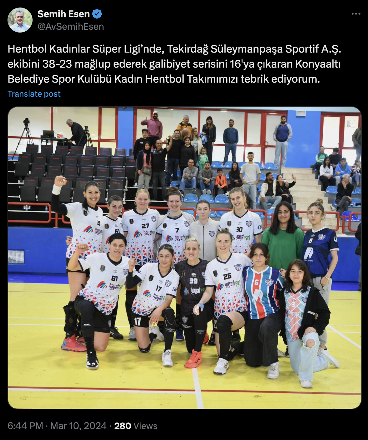 Konyaaltı Belediye Başkanı Semih Esen, "Hentbol Kadınlar Süper Ligi’nde, Tekirdağ Süleymanpaşa Sportif A.Ş. ekibini 38-23 mağlup ederek galibiyet serisini 16'ya çıkaran Konyaaltı Belediye Spor Kulübü Kadın Hentbol Takımımızı tebrik ediyorum." ifadelerini kullandı.