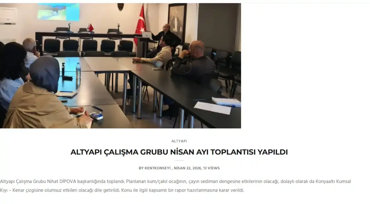 Altyapı Çalışma Grubu, Nihat Dipova başkanlığında toplandı. Toplantıda, planlanan kum-çakıl ocağının Çandır Çayı’nın sediman dengesini bozabileceği ifade edildi. Bu durumun dolaylı olarak Konyaaltı Sahili kıyı-kenar çizgisine olumsuz etkiler yaratabileceği yönünde değerlendirmeler yapıldı.