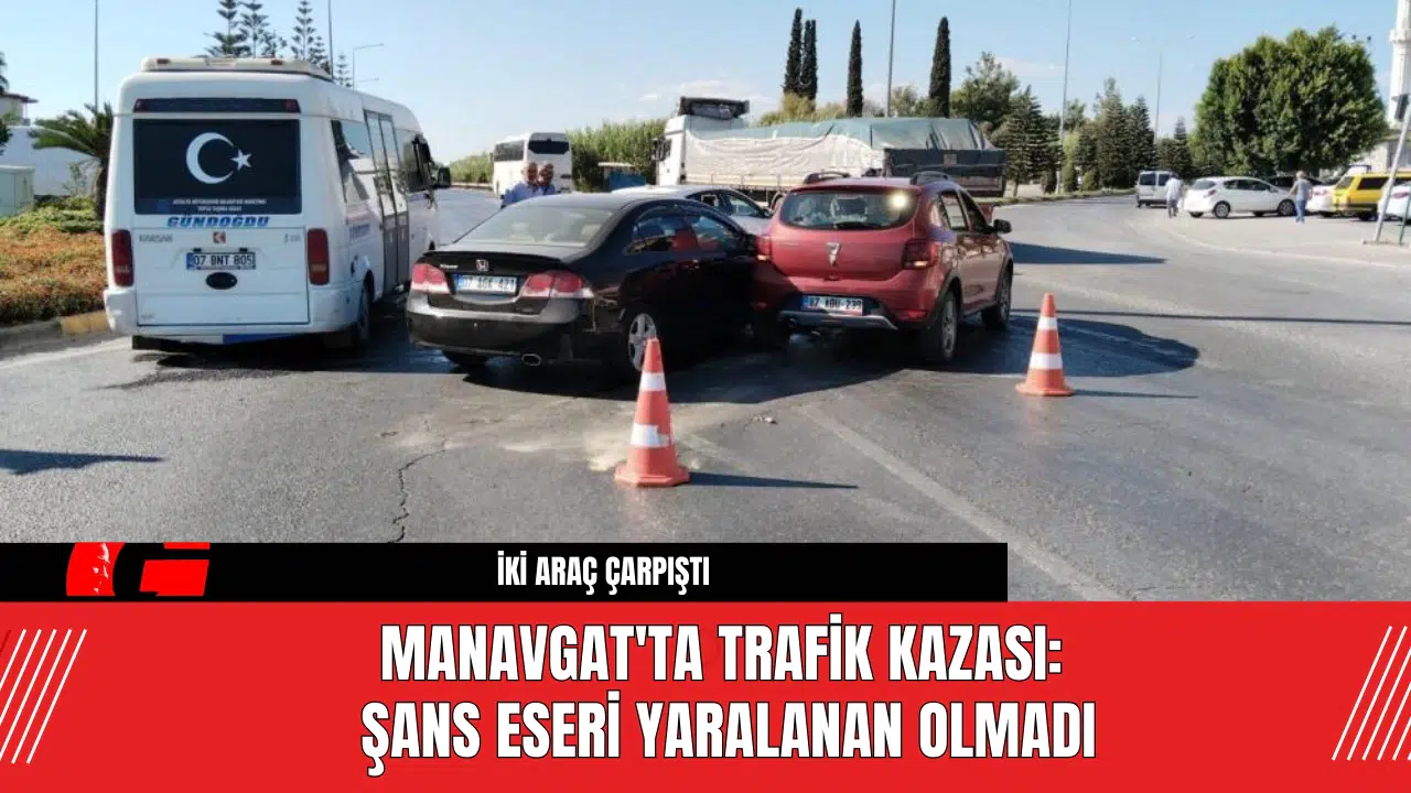 Antalya'nın Manavgat ilçesinde iki otomobilin çarpışması sonucu meydana gelen trafik kazasında, şans eseri yaralanan olmadı. Kaza sonrası araçların yol ortasında kalması nedeniyle trafik akışı bir süre kontrollü olarak tek şeritten sağlandı.