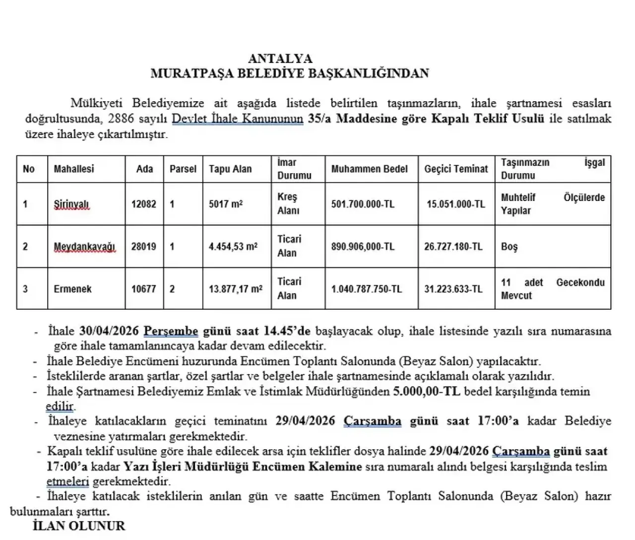 Belediye Encümeni huzurunda Encümen Toplantı Salonu’nda (Beyaz Salon) gerçekleştirilecek olan ihaleler, 30 Nisan 2026 Perşembe günü saat 14.45’te başlayacak.