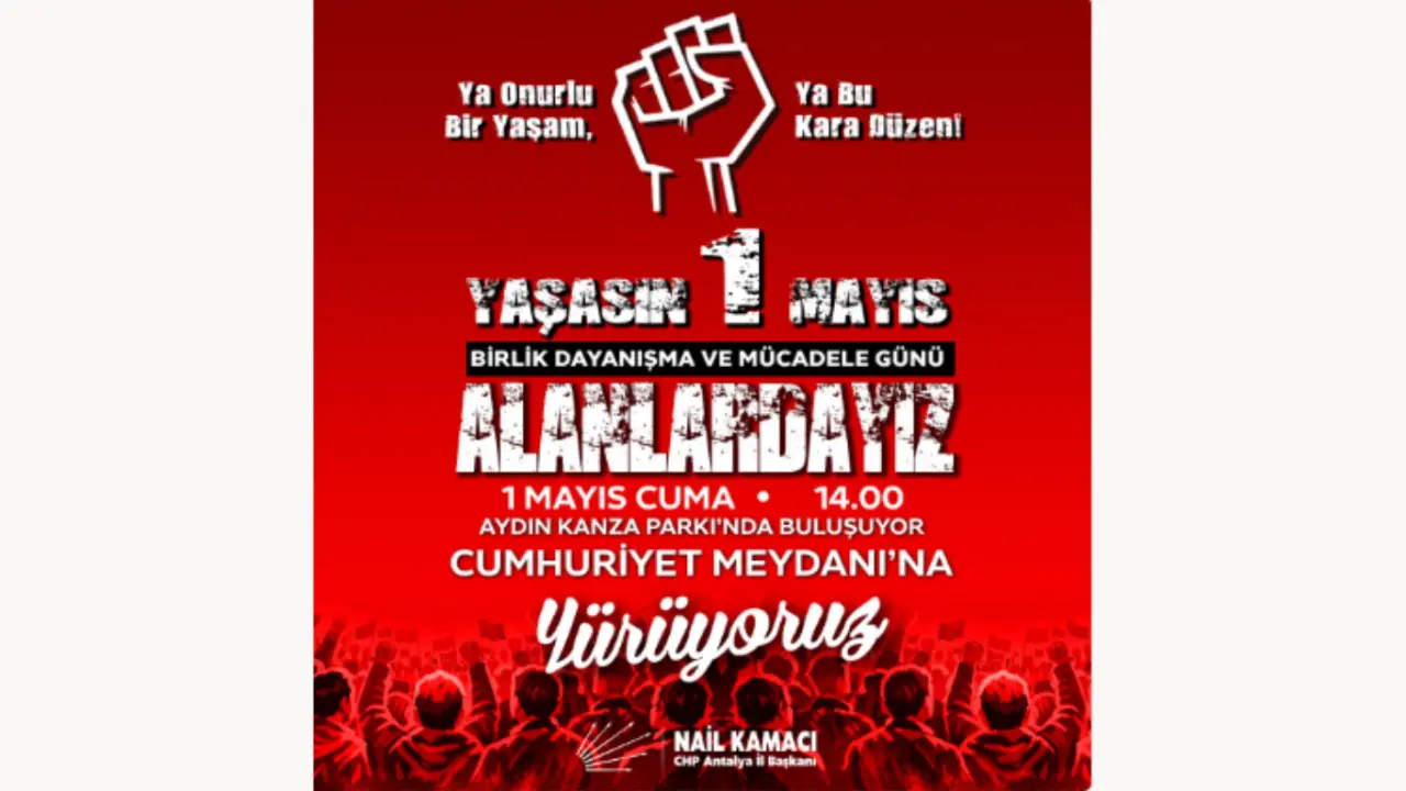 "CHP Antalya İl Başkanlığı olarak; 'Ya Onurlu Bir Yaşam, Ya Bu Kara Düzen!' sloganıyla 1 Mayıs Birlik, Mücadele ve Dayanışma Günü’nde alanlardayız. Emekçilerin hak ve özgürlüklerinin savunulması için tüm yol arkadaşlarımızı omuz omuza yürümeye çağırıyoruz."