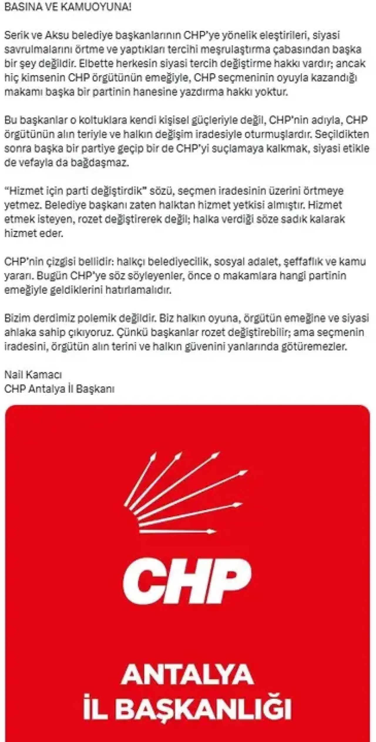 Başkanların açıklamalarına yönelik en sert açıklama CHP Antalya İl Başkanı Nail Kamacı’dan geldi. Kamacı, başkanların bu tercihlerini meşrulaştırmak için CHP’ye yönelik eleştirilerde bulunmalarını, kendi siyasi savrulmalarını örtbas etme çabası olarak tanımladı. Herkesin siyasi tercih hakkı olduğunu kabul eden Kamacı, "Serik ve Aksu belediye başkanlarının CHP’ye yönelik eleştirileri, siyasi savrulmalarını örtme ve yaptıkları tercihi meşrulaştırma çabasından başka bir şey değildir. Elbette herkesin siyasi tercih değiştirme hakkı vardır; ancak hiç kimsenin CHP örgütünün emeğiyle, CHP seçmeninin oyuyla kazandığı makamı başka bir partinin hanesine yazdırma hakkı yoktur" dedi.